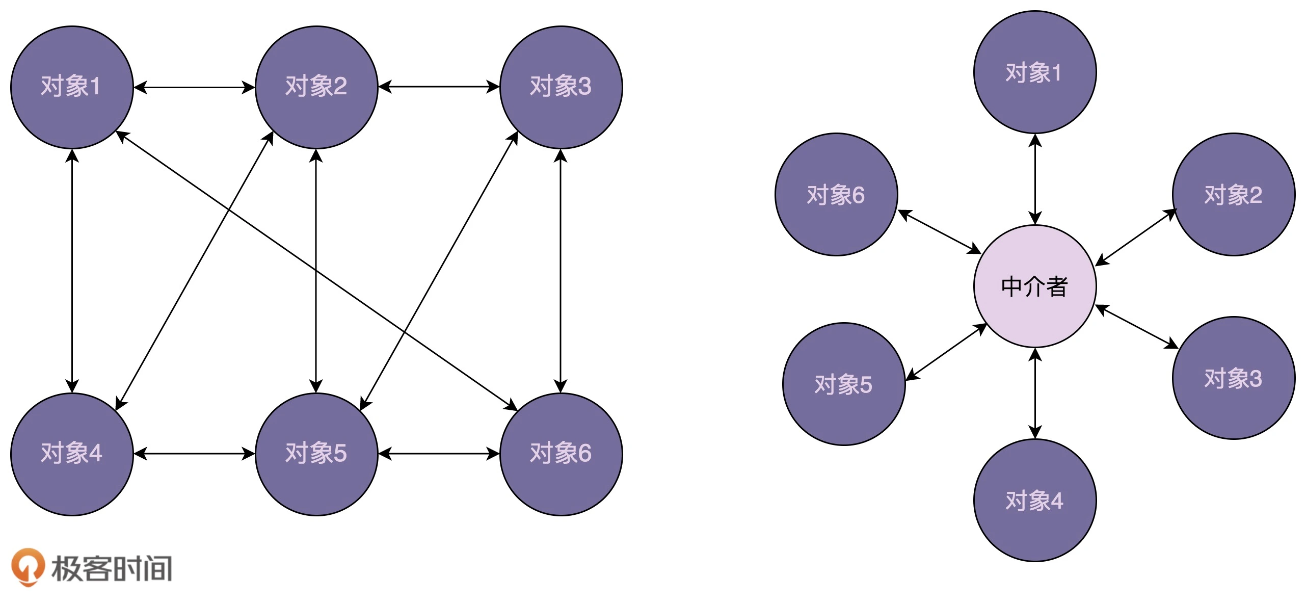 中介模式的设计思想跟中间层很像,通过引入中介这个中间层,将一组对象之间的交互关系(或者说依赖关系)从多对多(网状关系)转换为一对多(星状关系)。原来一个对象要跟 n 个对象交互,现在只需要跟一个中介对象交互,从而最小化对象之间的交互关系,降低了代码的复杂度,提高了代码的可读性和可维护性。