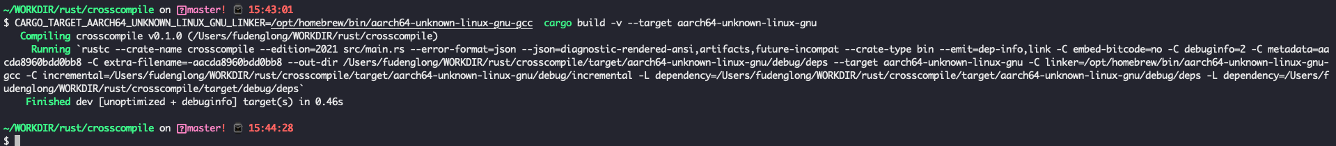 1 2 3 4 5 6 7 ~/WORKDIR/rust/crosscompile on master! ⌚ 17:15:21 $ ll .cargo/config -rw-r--r-- 1 fudenglong staff 94B 4 8 17:13 .cargo/config ~/WORKDIR/rust/crosscompile on master! ⌚ 17:15:25 $ cat .cargo/config [target.aarch64-unknown-linux-gnu] linker = "/opt/homebrew/bin/aarch64-unknown-linux-gnu-gcc"