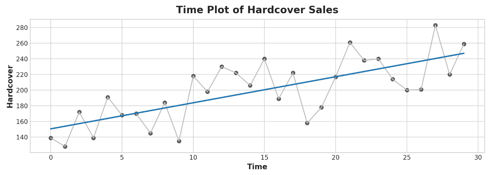 1 2 3 4 5 6 7 8 9 10 11 12 13 14 15 16 17 18 19 20 21 22 23 24 25 import matplotlib.pyplot as pltimport seaborn as snsplt.style.use("seaborn-whitegrid" ) plt.rc( "figure" , autolayout=True , figsize=(11 , 4 ), titlesize=18 , titleweight='bold' , ) plt.rc( "axes" , labelweight="bold" , labelsize="large" , titleweight="bold" , titlesize=16 , titlepad=10 , ) %config InlineBackend.figure_format = 'retina' fig, ax = plt.subplots() ax.plot('Time' , 'Hardcover' , data=df, color='0.75' ) ax = sns.regplot(x='Time' , y='Hardcover' , data=df, ci=None , scatter_kws=dict (color='0.25' )) ax.set_title('Time Plot of Hardcover Sales' );