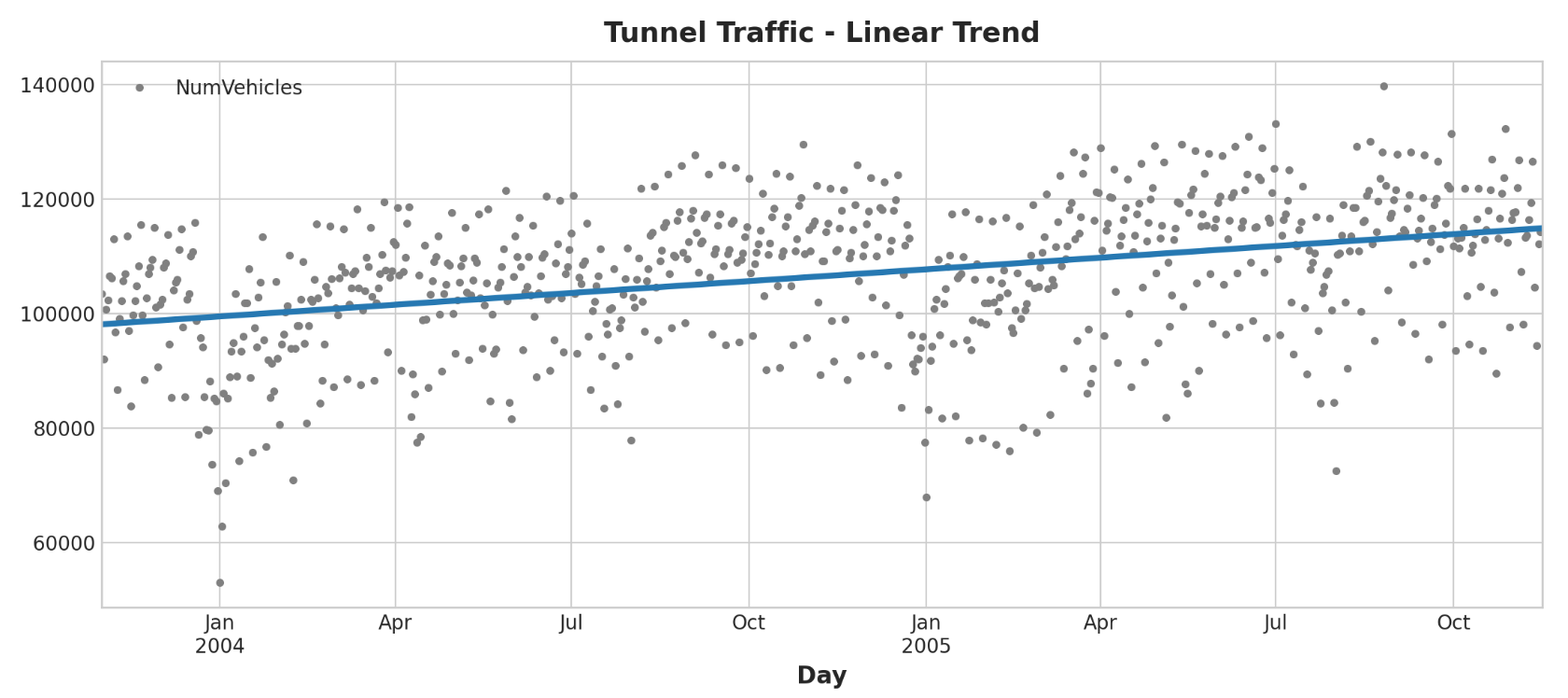 1 2 ax = tunnel.plot(style="." , color="0.5" , title="Tunnel Traffic - Linear Trend" ) _ = y_pred.plot(ax=ax, linewidth=3 , label="Trend" )