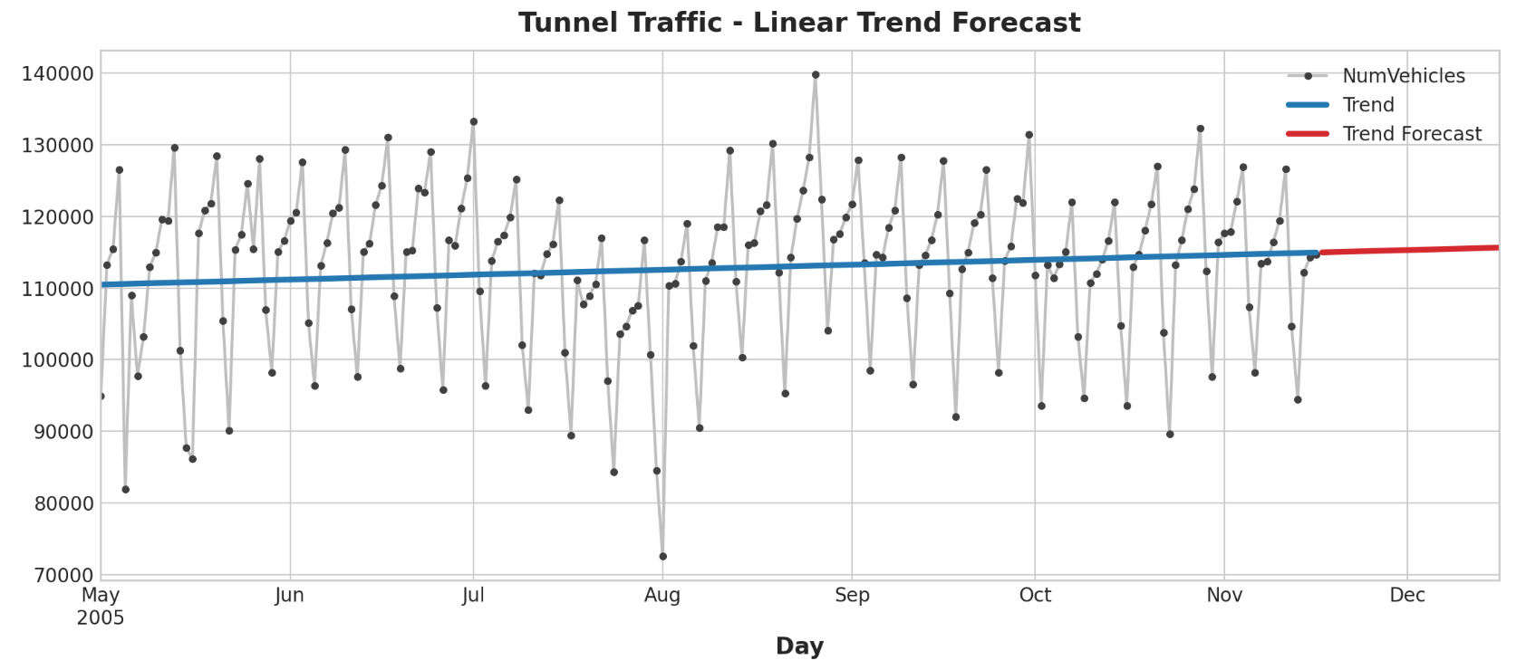 1 2 3 4 ax = tunnel["2005-05" :].plot(title="Tunnel Traffic - Linear Trend Forecast" , **plot_params) ax = y_pred["2005-05" :].plot(ax=ax, linewidth=3 , label="Trend" ) ax = y_fore.plot(ax=ax, linewidth=3 , label="Trend Forecast" , color="C3" ) _ = ax.legend()