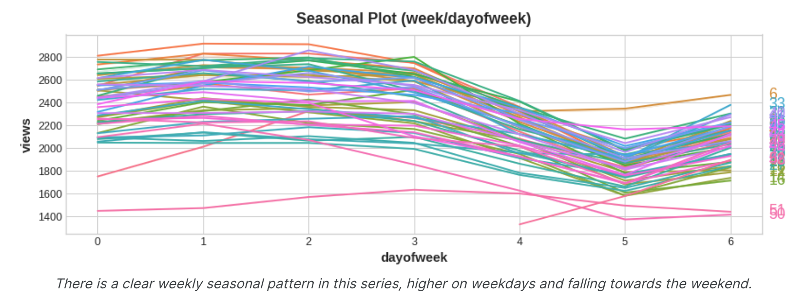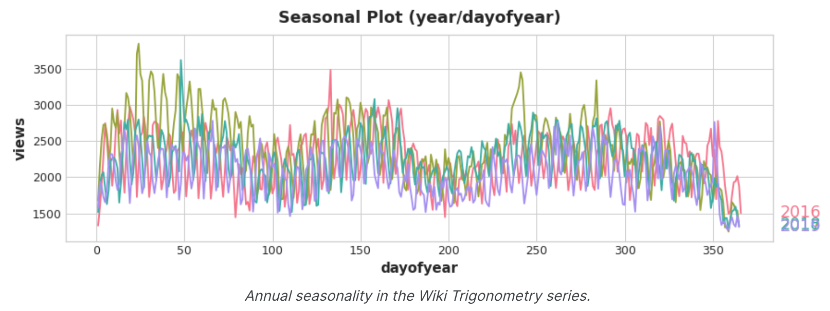 季节图和季节指标 季节图 就像我们使用移动平均图来发现序列中的趋势一样,我们可以使用季节图 来发现季节性模式。季节性图显示针对某个共同时期绘制的时间序列的片段,该时期是您要观察的“季节”。该图显示了维基百科关于三角学的文章的每日浏览量的季节图:该文章的每日浏览量绘制在共同的每周时间段内。