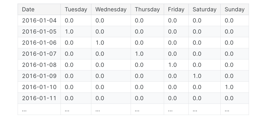 季节性指标 季节性指标是表示时间序列水平季节性差异的二元特征。如果将季节性周期视为分类特征并应用one-hot编码,则会得到季节性指标。通过对一周中的某一天进行单热编码,我们可以获得每周的季节性指标。为三角系列创建每周指标将为我们提供六个新的“虚拟”特征。(如果放弃其中一个指标,线性回归效果最好;我们在下面的框架中选择了星期一。)
