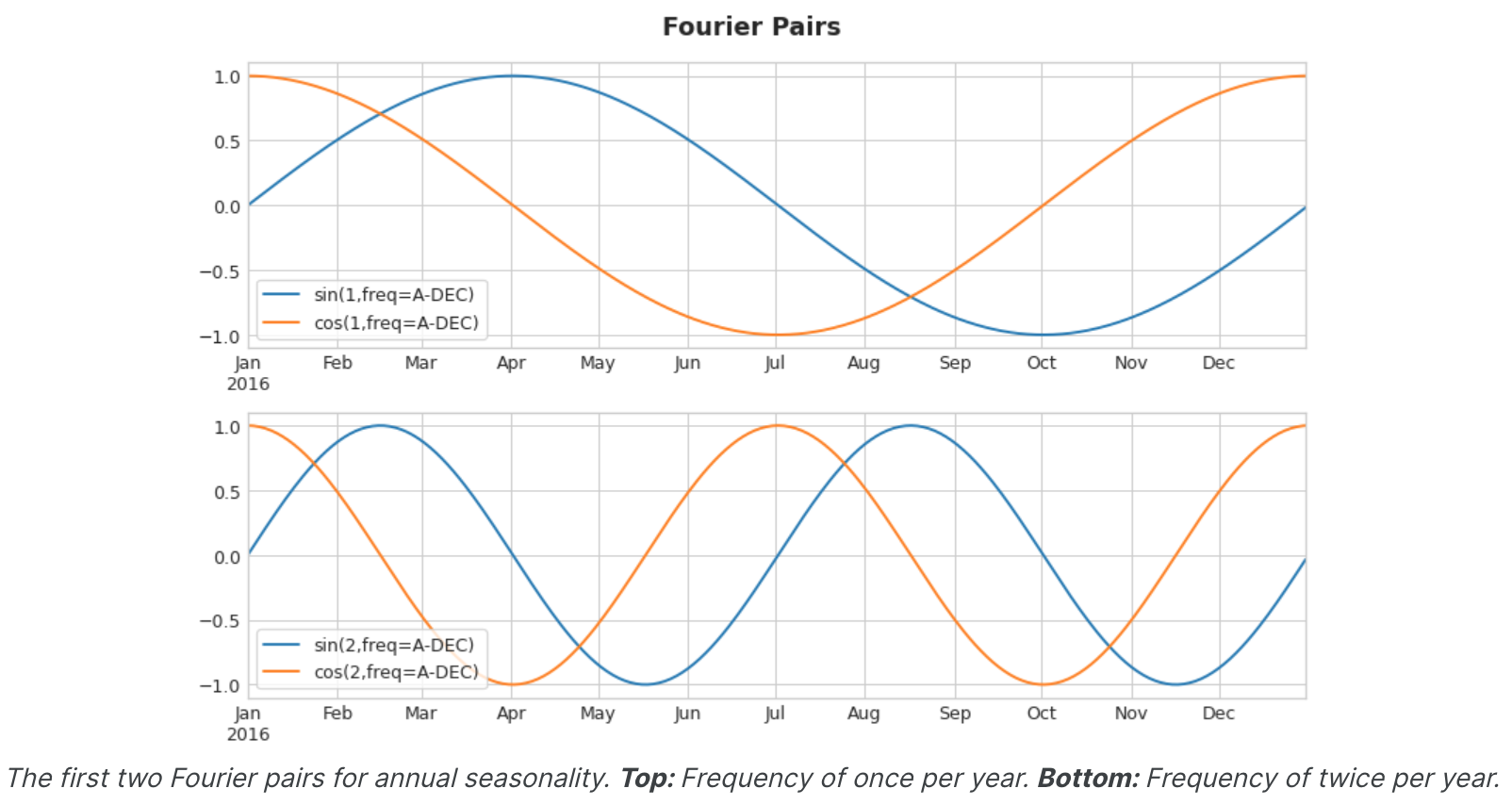 我们尝试用傅立叶特征来捕获季节内的这些频率。这个想法是在我们的训练数据中包含与我们尝试建模的季节具有相同频率的周期曲线。我们使用的曲线是三角函数正弦和余弦的曲线。傅立叶特征是成对的正弦和余弦曲线,一对对应于季节中从最长的开始的每个潜在频率。模拟年度季节性的傅立叶对具有频率:每年一次、每年两次、每年三次,依此类推。