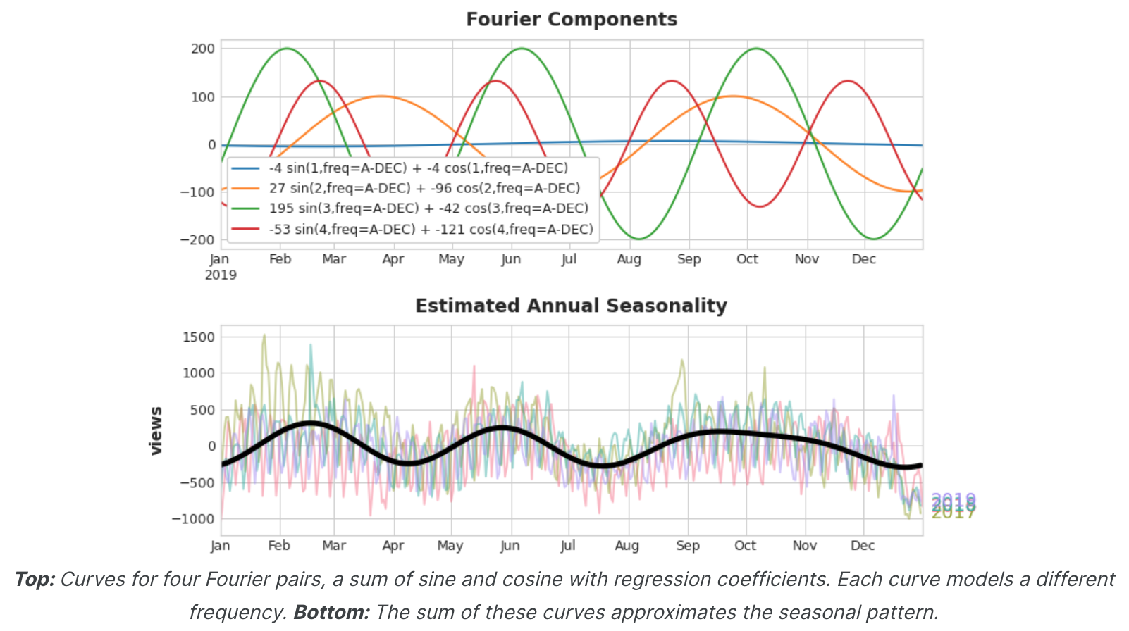 如果我们将一组正弦/余弦曲线添加到训练数据中,线性回归算法将计算出适合目标序列中季节性分量的权重。该图说明了线性回归如何使用四个傅里叶对来模拟三角系列中的年度季节性。