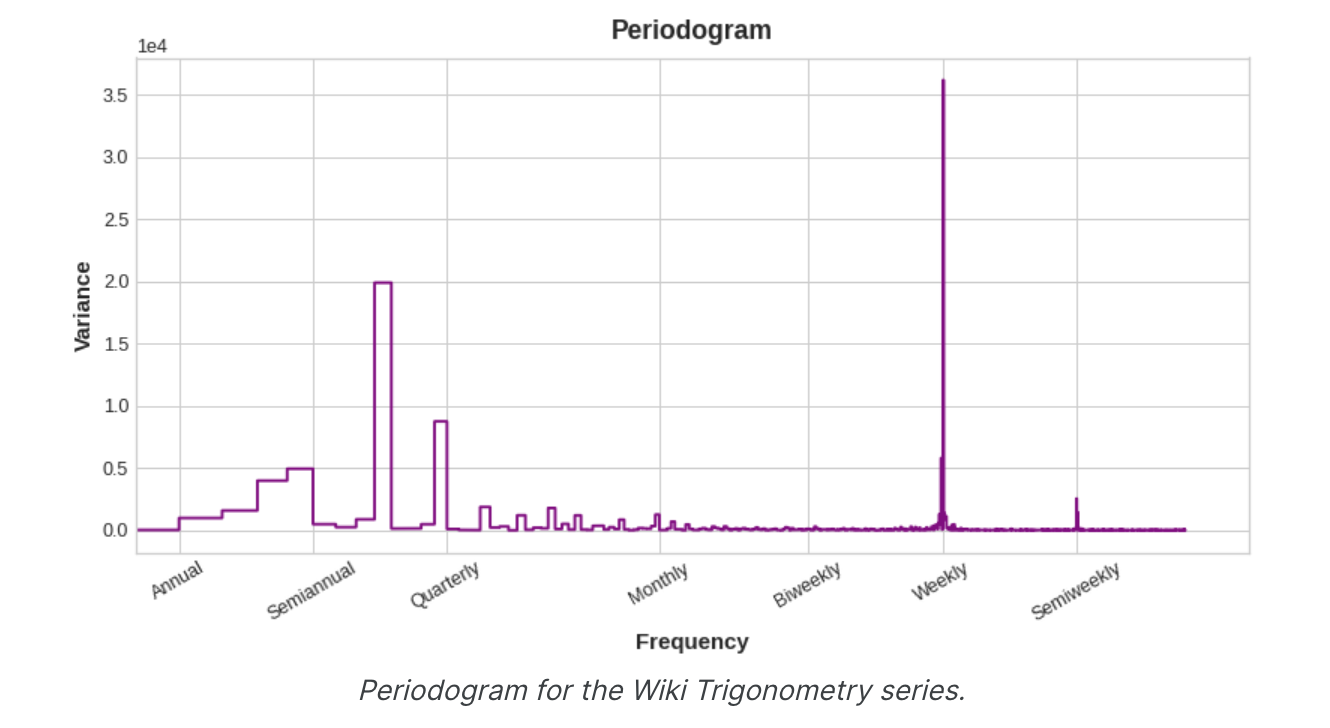 使用周期图选择傅里叶特征 我们的特征集中实际上应该包含多少个傅里叶对?我们可以用周期图来回答这个问题。周期图告诉您时间序列中频率的强度。具体来说,图表y轴上的值为(a ** 2 + b ** 2) / 2,其中a和 b是该频率下的正弦和余弦系数(如上面的傅立叶分量图中所示)。