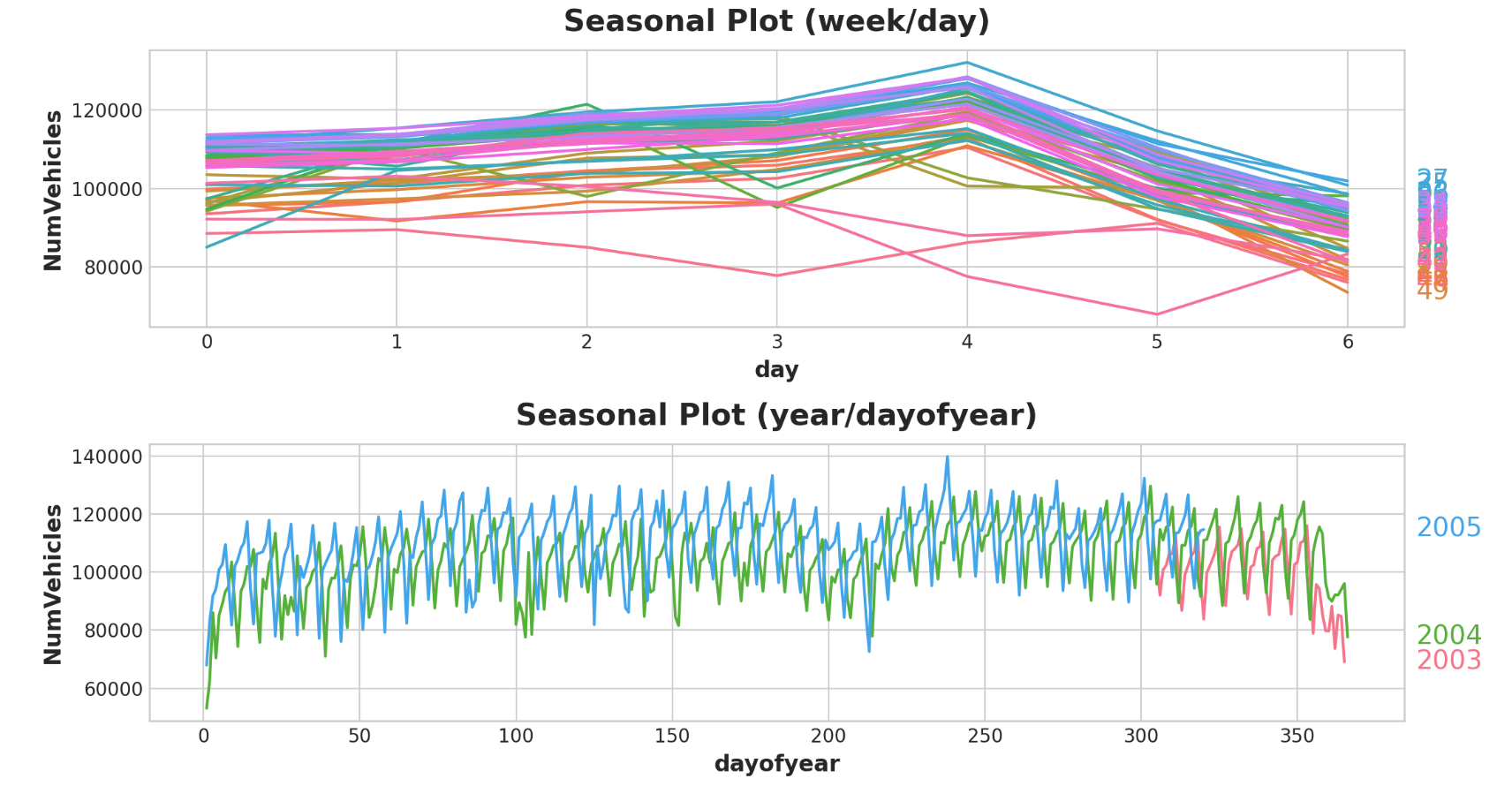 1 2 3 4 5 6 7 8 9 10 11 12 X = tunnel.copy() X["day" ] = X.index.dayofweek X["week" ] = X.index.week X["dayofyear" ] = X.index.dayofyear X["year" ] = X.index.year fig, (ax0, ax1) = plt.subplots(2 , 1 , figsize=(11 , 6 )) seasonal_plot(X, y="NumVehicles" , period="week" , freq="day" , ax=ax0) seasonal_plot(X, y="NumVehicles" , period="year" , freq="dayofyear" , ax=ax1);