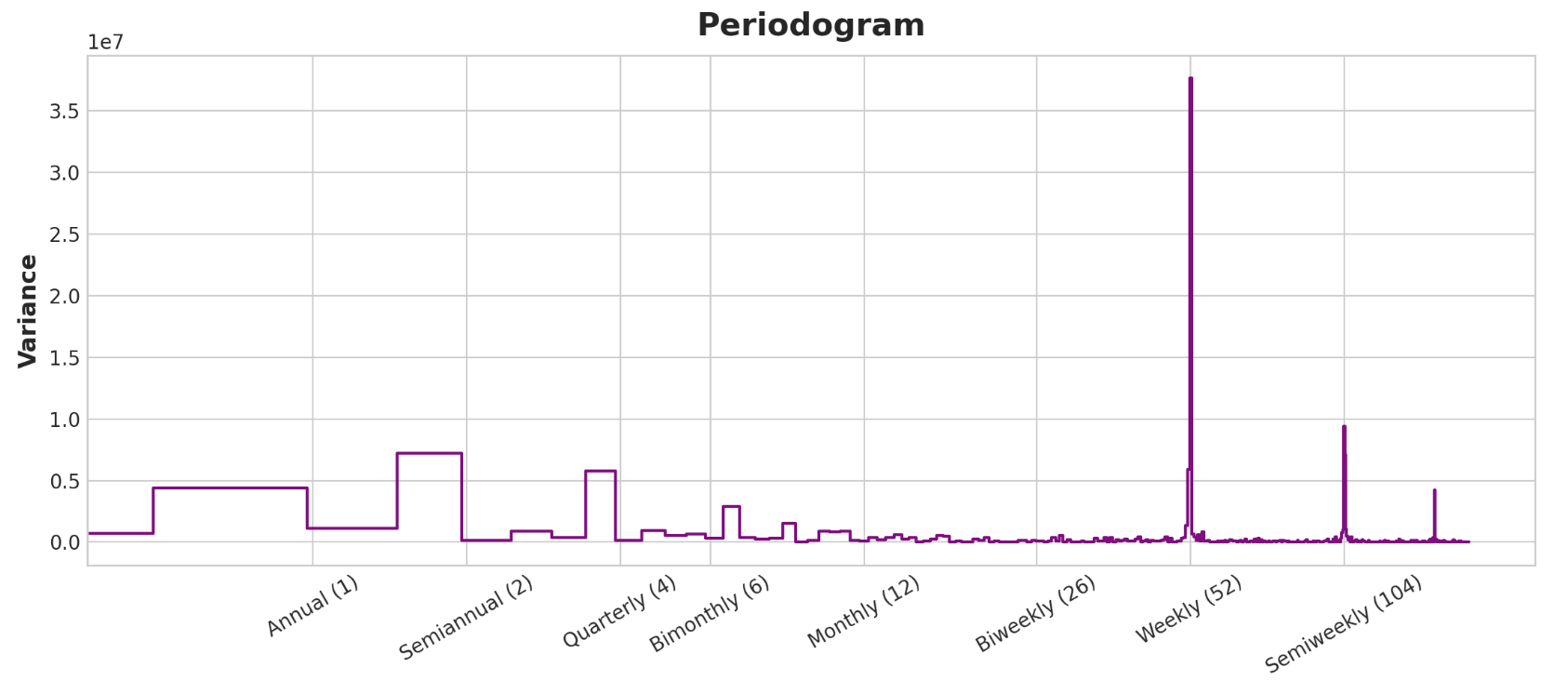 从左到右,周期图在季度之后下降,每年四次。这就是为什么我们选择四个傅里叶对来模拟年度季节。我们忽略每周频率,因为它更好地用指标建模。