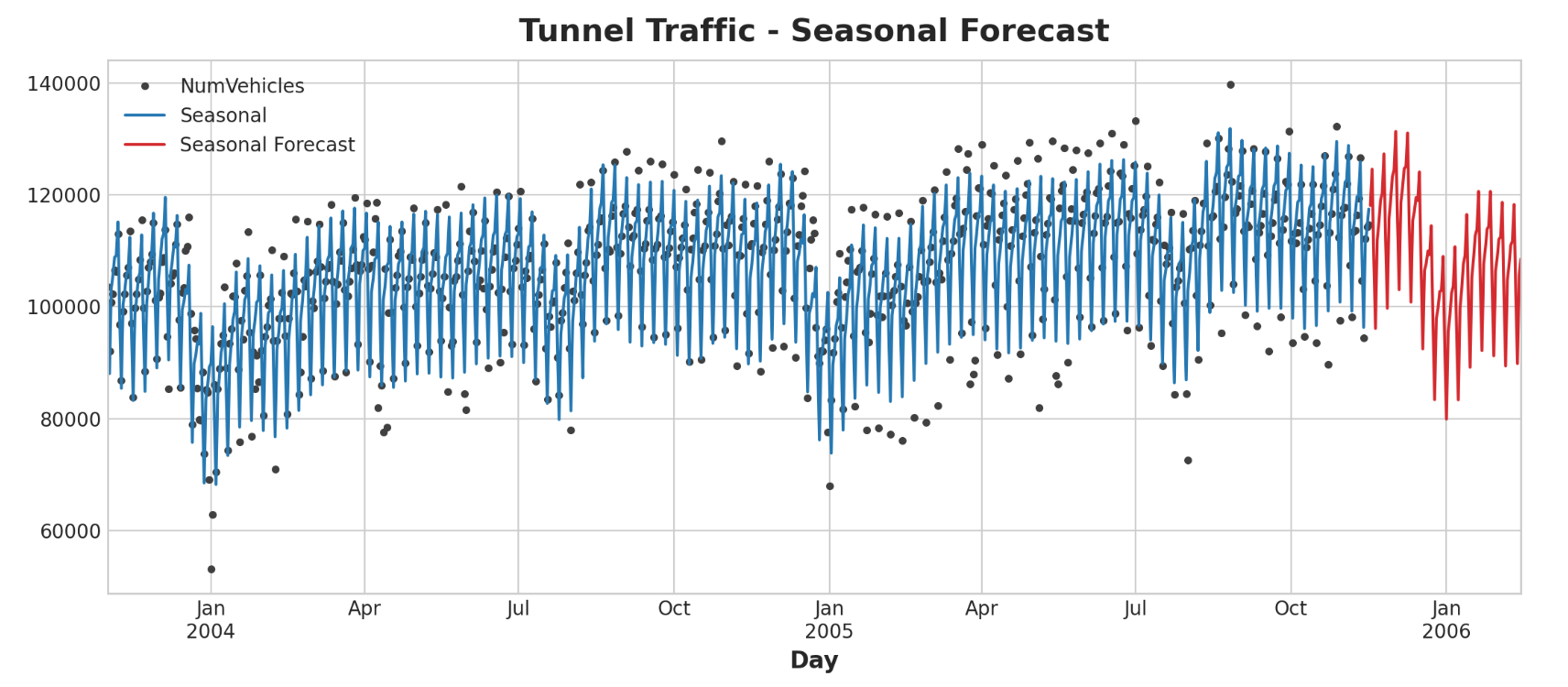 1 2 3 4 5 6 7 8 9 10 11 12 13 y = tunnel["NumVehicles" ] model = LinearRegression(fit_intercept=False ) _ = model.fit(X, y) y_pred = pd.Series(model.predict(X), index=y.index) X_fore = dp.out_of_sample(steps=90 ) y_fore = pd.Series(model.predict(X_fore), index=X_fore.index) ax = y.plot(color='0.25' , style='.' , title="Tunnel Traffic - Seasonal Forecast" ) ax = y_pred.plot(ax=ax, label="Seasonal" ) ax = y_fore.plot(ax=ax, label="Seasonal Forecast" , color='C3' ) _ = ax.legend()