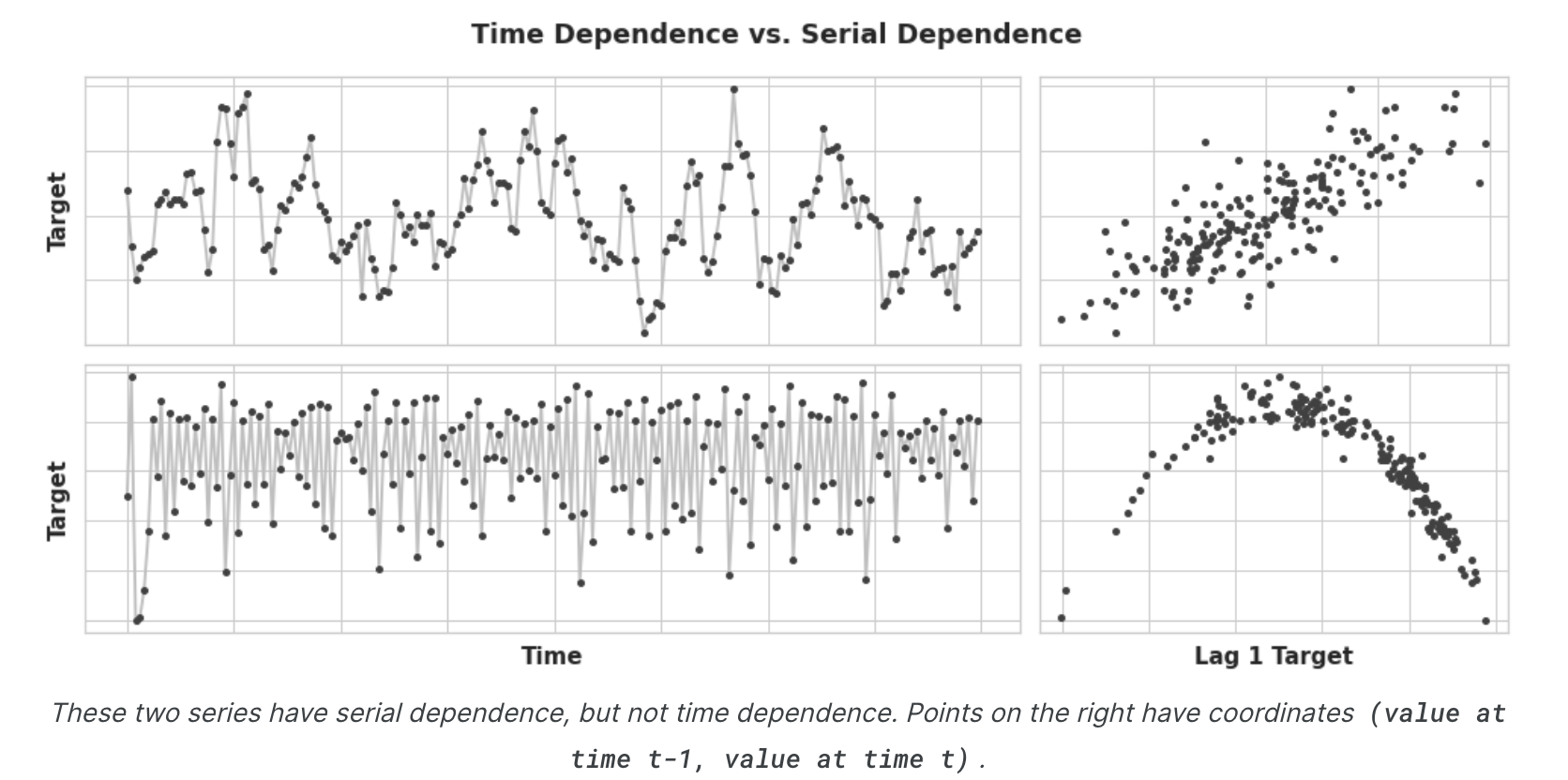 时间序列作为特征 什么是串行依赖? 我们研究了最容易建模为时间相关属性的时间序列属性,即我们可以直接从时间索引导出的特征。然而,某些时间序列属性只能建模为序列相关属性,即使用目标序列的过去值作为特征。从随时间变化的图中看,这些时间序列的结构可能并不明显;然而,根据过去的值绘制,结构变得清晰——如下图所示。