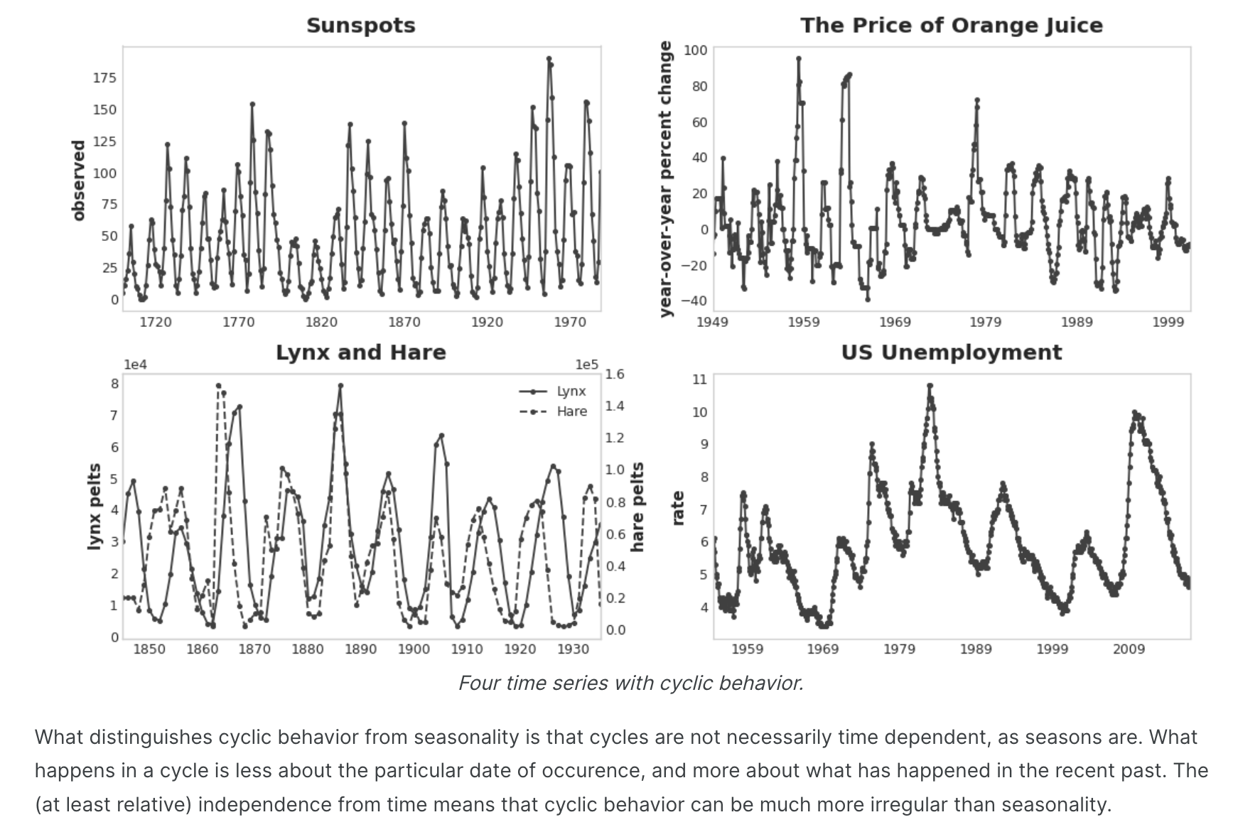 周期性行为与季节性的区别在于,周期不一定像季节那样依赖于时间。一个周期中发生的事情与特定的发生日期无关,而更多地与最近发生的事情有关。与时间的(至少相对)独立性意味着周期性行为可能比季节性行为更加不规则。