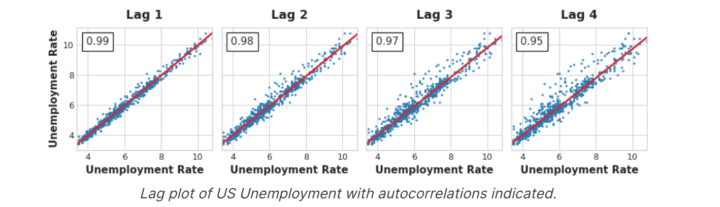 最常用的序列依赖性度量称为自相关 ,它只是时间序列与其滞后之一的相关性。美国失业率在滞后1时的自相关性为0.99,在滞后2时的自相关性为0.98,依此类推。