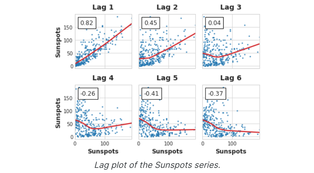 像上面这样的图称为相关图。相关图用于滞后特征,本质上就像周期图用于傅立叶特征一样。最后,我们需要注意,自相关和部分自相关是线性相关性的度量。由于现实世界的时间序列通常具有大量的非线性依赖性,因此在选择滞后特征时最好查看滞后图(或使用一些更通用的依赖性度量,例如互信息 )。太阳黑子系列具有非线性依赖性的滞后性,我们可能会通过自相关来忽略这一点。