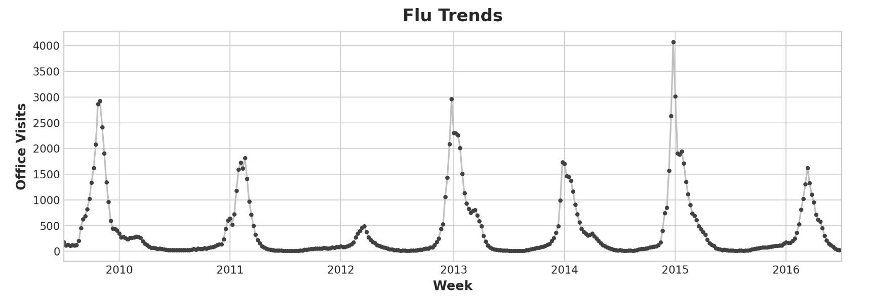 举例 - 流感趋势 流感趋势数据集包含2009年至2016年间几周内因流感就诊的医生记录。我们的目标是预测未来几周的流感病例数。我们将采取两种方法。首先,我们将使用滞后特征来预测医生的就诊次数。我们的第二种方法是使用另一组时间序列的滞后来预测医生的就诊:谷歌趋势捕获的与流感相关的搜索词。