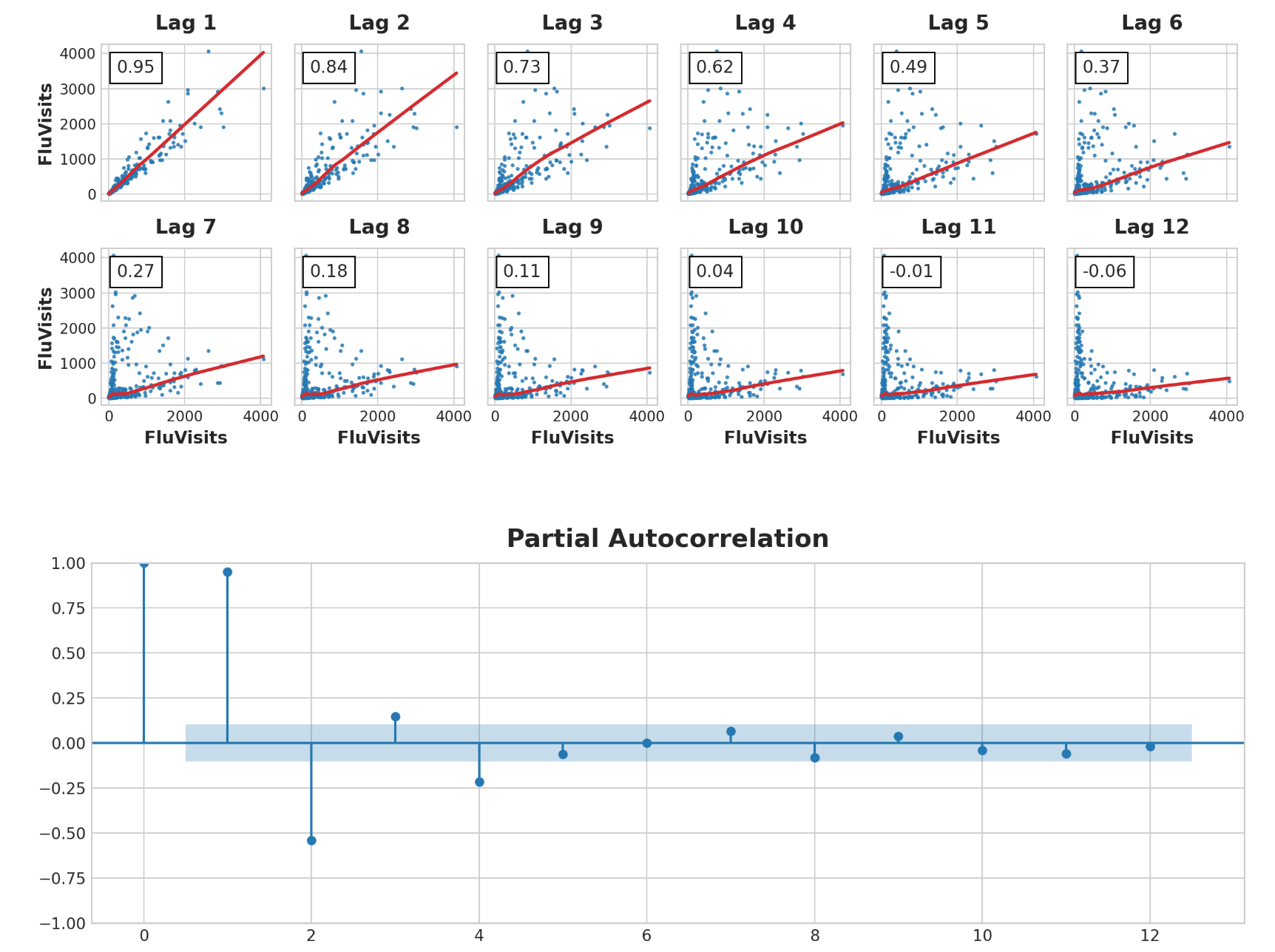 1 2 _ = plot_lags(flu_trends.FluVisits, lags=12 , nrows=2 ) _ = plot_pacf(flu_trends.FluVisits, lags=12 )