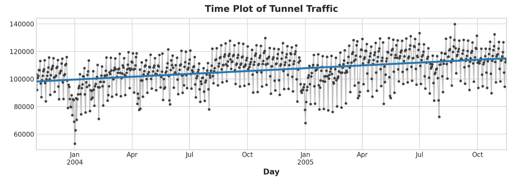 1 2 3 ax = y.plot(**plot_params) ax = y_pred.plot(ax=ax, linewidth=3 ) ax.set_title('Time Plot of Tunnel Traffic' );