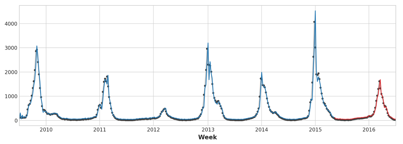 1 2 3 4 5 6 7 8 9 10 11 12 13 14 y = flu_trends.FluVisits.copy() X_train, X_test, y_train, y_test = train_test_split(X, y, test_size=60 , shuffle=False ) model = LinearRegression() model.fit(X_train, y_train) y_pred = pd.Series(model.predict(X_train), index=y_train.index) y_fore = pd.Series(model.predict(X_test), index=y_test.index) ax = y_train.plot(**plot_params) ax = y_test.plot(**plot_params) ax = y_pred.plot(ax=ax) _ = y_fore.plot(ax=ax, color='C3' )