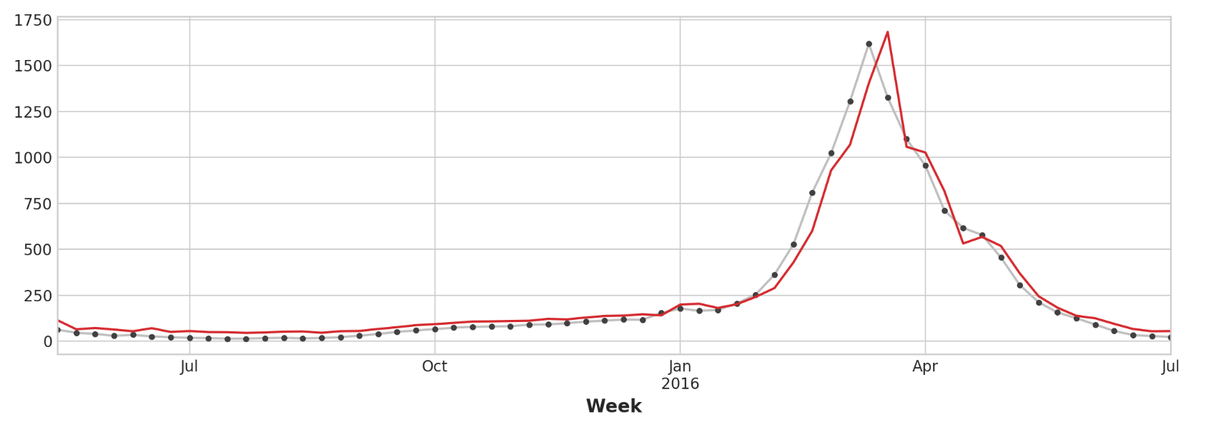 1 2 ax = y_test.plot(**plot_params) _ = y_fore.plot(ax=ax, color='C3' )
