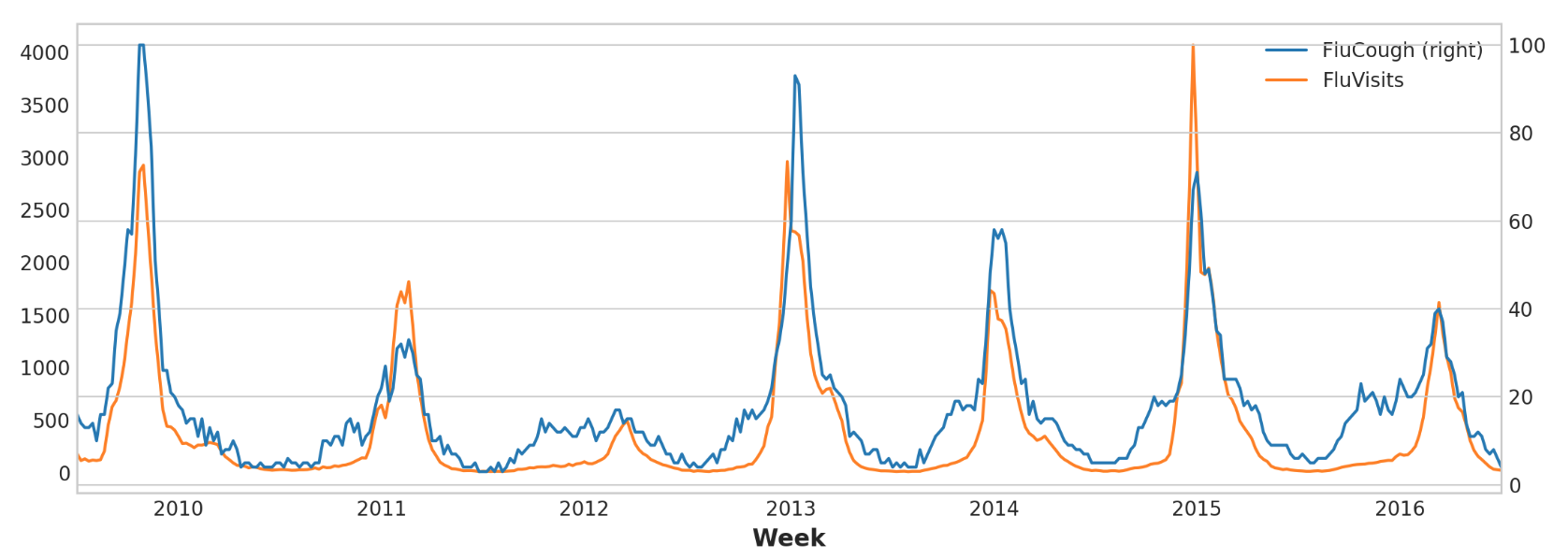 1 2 3 4 ax = flu_trends.plot( y=["FluCough" , "FluVisits" ], secondary_y="FluCough" , )