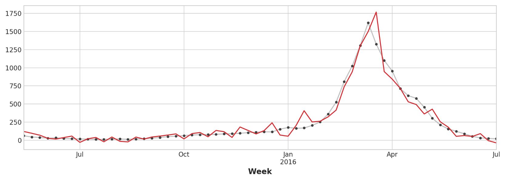 XGBoost显然在训练集上过度拟合。但在测试集上,它似乎能够比线性回归模型更好地捕捉流感季节的一些动态。通过一些超参数调整,它可能会做得更好。