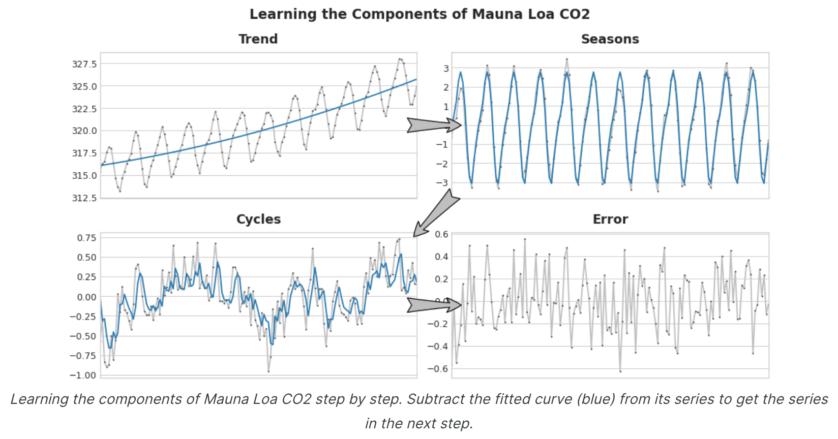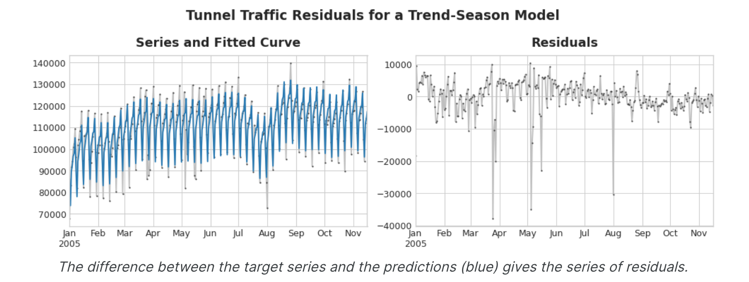 上图左侧是隧道交通序列和趋势-季节曲线的一部分。减去拟合曲线后,剩下的残差位于右侧。残差包含趋势-季节性模型未学到的隧道流量中的所有内容。我们可以将学习时间序列的组成部分想象为一个迭代过程:首先学习趋势并将其从序列中减去,然后从去趋势残差中学习季节性并减去季节,然后学习周期并减去周期,最后只剩下不可预测的错误。