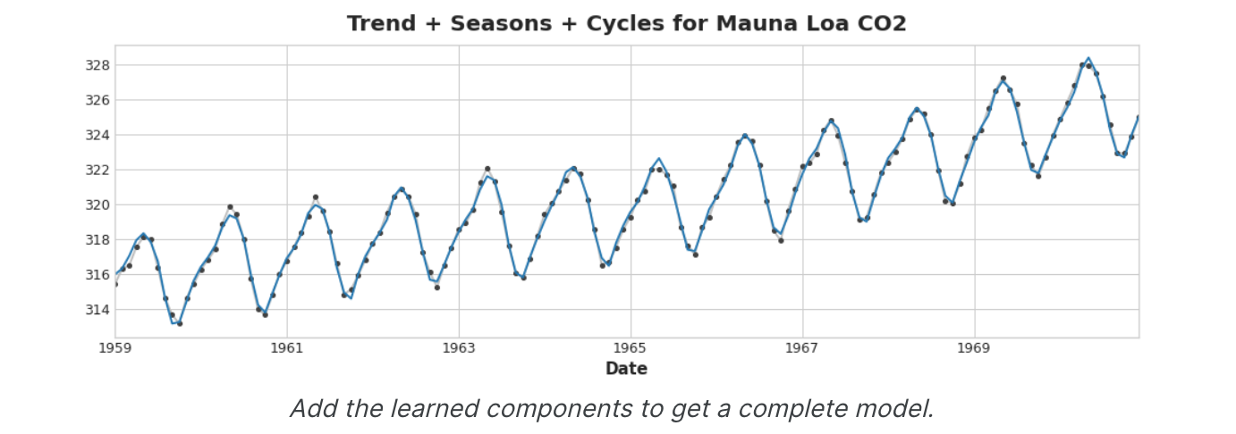 将我们学到的所有组件加在一起,我们就得到了完整的模型。如果你用一整套建模趋势、季节和周期的特征来训练线性回归,这本质上就是线性回归的作用。