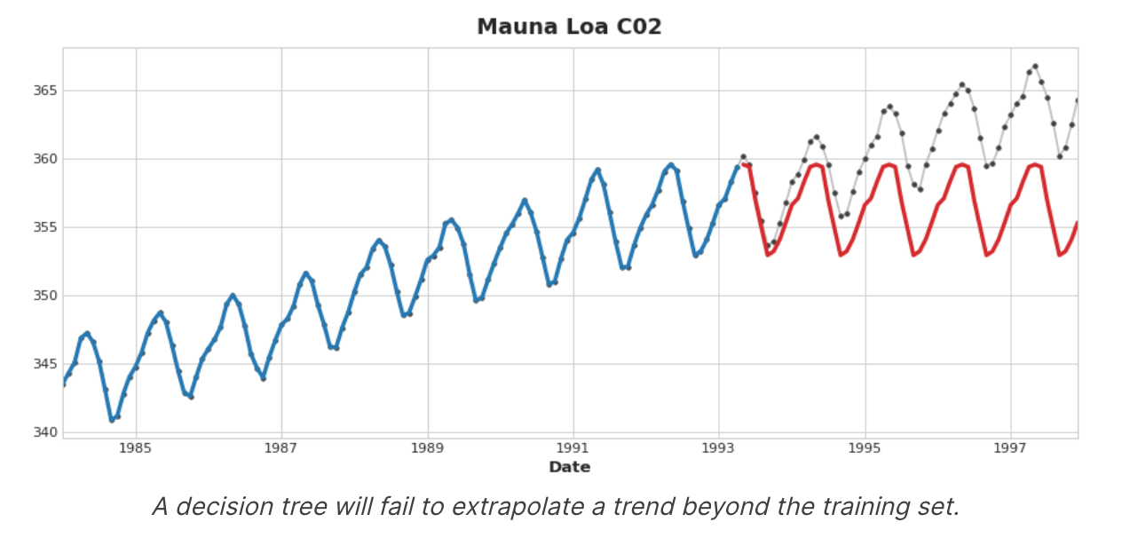 除了充当更复杂模型的基线或起点之外,我们还可以将它们用作“混合模型”中的组件,其中算法无法学习趋势(例如XGBoost和随机森林)。