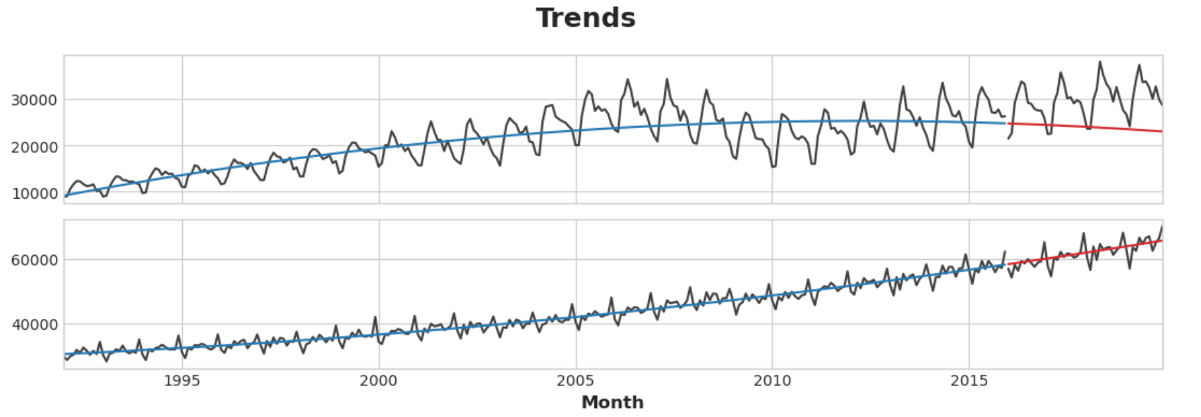 1 2 3 4 5 6 7 8 9 10 11 12 13 14 15 16 17 18 19 20 21 22 23 24 25 26 27 28 29 30 31 32 33 34 35 36 37 38 39 40 41 42 y = retail.copy() dp = DeterministicProcess( index=y.index, constant=True , order=2 , drop=True , ) X = dp.in_sample() idx_train, idx_test = train_test_split( y.index, test_size=12 * 4 , shuffle=False , ) X_train, X_test = X.loc[idx_train, :], X.loc[idx_test, :] y_train, y_test = y.loc[idx_train], y.loc[idx_test] model = LinearRegression(fit_intercept=False ) model.fit(X_train, y_train) y_fit = pd.DataFrame( model.predict(X_train), index=y_train.index, columns=y_train.columns, ) y_pred = pd.DataFrame( model.predict(X_test), index=y_test.index, columns=y_test.columns, ) axs = y_train.plot(color='0.25' , subplots=True , sharex=True ) axs = y_test.plot(color='0.25' , subplots=True , sharex=True , ax=axs) axs = y_fit.plot(color='C0' , subplots=True , sharex=True , ax=axs) axs = y_pred.plot(color='C3' , subplots=True , sharex=True , ax=axs) for ax in axs: ax.legend([])_ = plt.suptitle("Trends" )