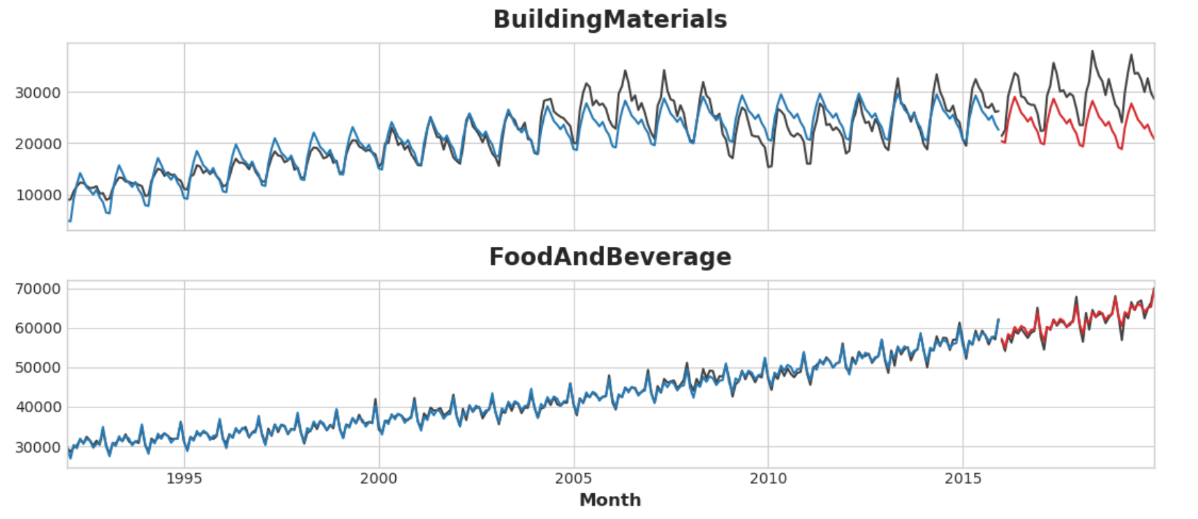 1 2 3 4 5 6 7 8 9 10 11 12 13 14 15 axs = y_train.unstack(['Industries' ]).plot( color='0.25' , figsize=(11 , 5 ), subplots=True , sharex=True , title=['BuildingMaterials' , 'FoodAndBeverage' ], ) axs = y_test.unstack(['Industries' ]).plot( color='0.25' , subplots=True , sharex=True , ax=axs, ) axs = y_fit_boosted.unstack(['Industries' ]).plot( color='C0' , subplots=True , sharex=True , ax=axs, ) axs = y_pred_boosted.unstack(['Industries' ]).plot( color='C3' , subplots=True , sharex=True , ax=axs, ) for ax in axs: ax.legend([])