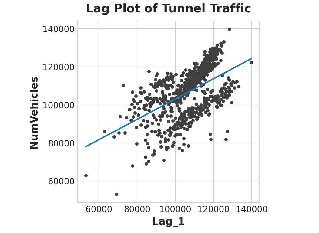 1 2 3 4 5 6 7 fig, ax = plt.subplots() ax.plot(X['Lag_1' ], y, '.' , color='0.25' ) ax.plot(X['Lag_1' ], y_pred) ax.set_aspect('equal' ) ax.set_ylabel('NumVehicles' ) ax.set_xlabel('Lag_1' ) ax.set_title('Lag Plot of Tunnel Traffic' );