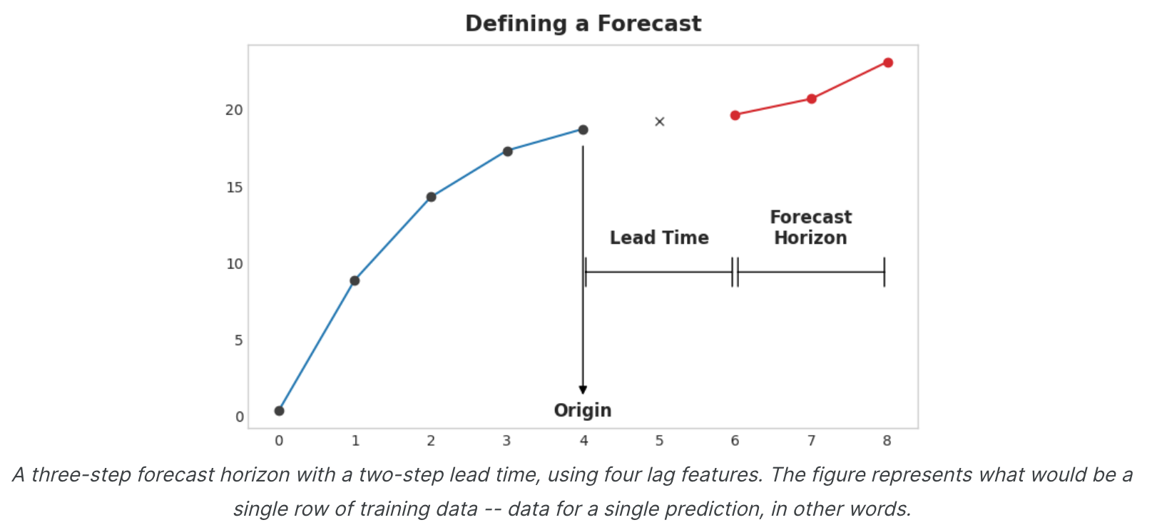预测原点是您进行预测的时间。实际上,您可能会认为预测原点是您最后一次拥有当前预测训练数据的时间。直到起源的所有东西都可以用来创建特征。预测范围是您进行预测的时间。我们经常通过其范围内的时间步数来描述预测:例如“1步”预测或“5步”预测。预测范围描述了目标。