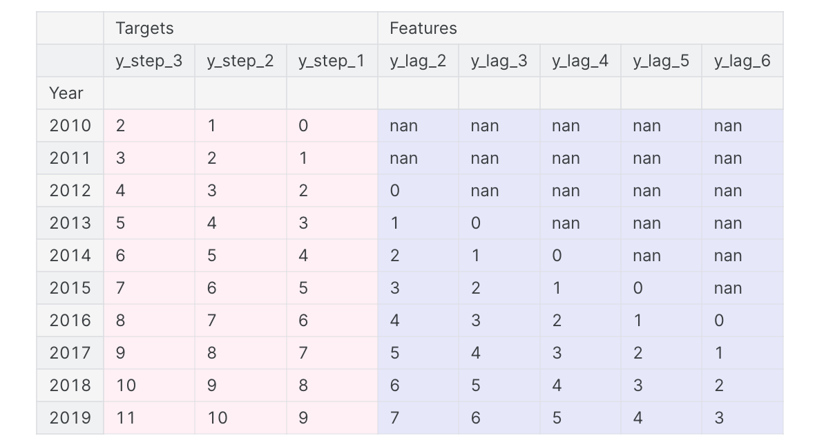 1 2 3 4 5 6 7 8 9 10 11 12 13 14 15 16 17 18 19 20 21 22 23 24 25 26 27 28 29 30 import numpy as npimport pandas as pdN = 20 ts = pd.Series( np.arange(N), index=pd.period_range(start='2010' , freq='A' , periods=N, name='Year' ), dtype=pd.Int8Dtype, ) X = pd.DataFrame({ 'y_lag_2' : ts.shift(2 ), 'y_lag_3' : ts.shift(3 ), 'y_lag_4' : ts.shift(4 ), 'y_lag_5' : ts.shift(5 ), 'y_lag_6' : ts.shift(6 ), }) y = pd.DataFrame({ 'y_step_3' : ts.shift(-2 ), 'y_step_2' : ts.shift(-1 ), 'y_step_1' : ts, }) data = pd.concat({'Targets' : y, 'Features' : X}, axis=1 ) data.head(10 ).style.set_properties(['Targets' ], **{'background-color' : 'LavenderBlush' }) \ .set_properties(['Features' ], **{'background-color' : 'Lavender' })