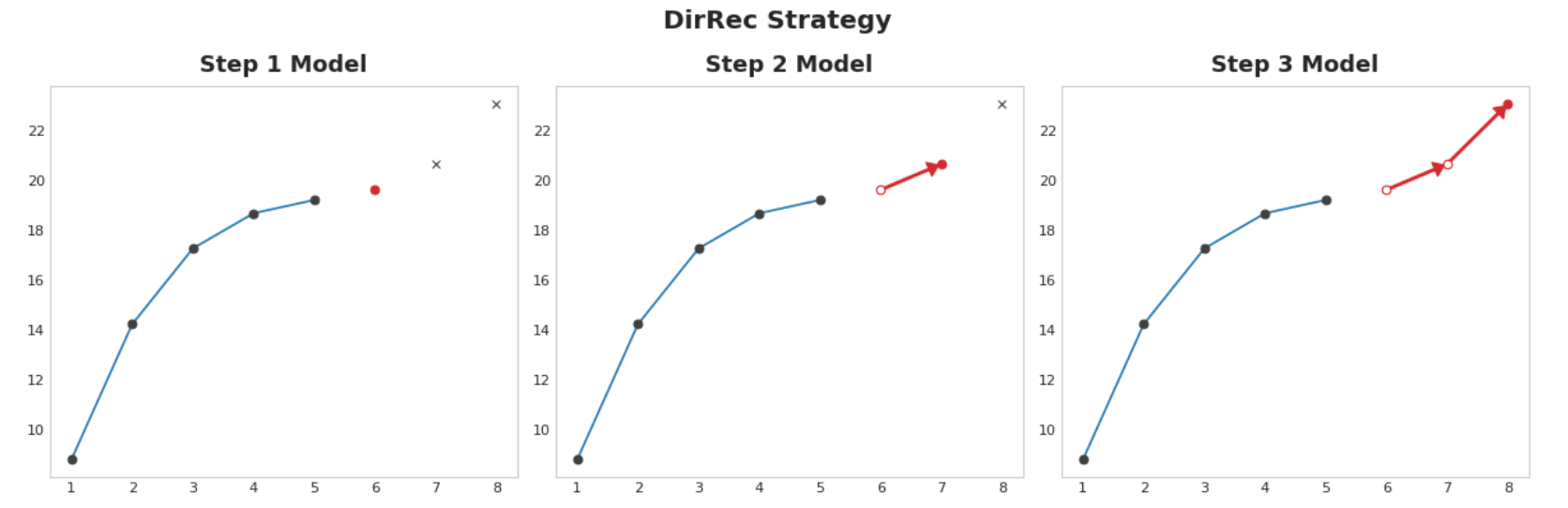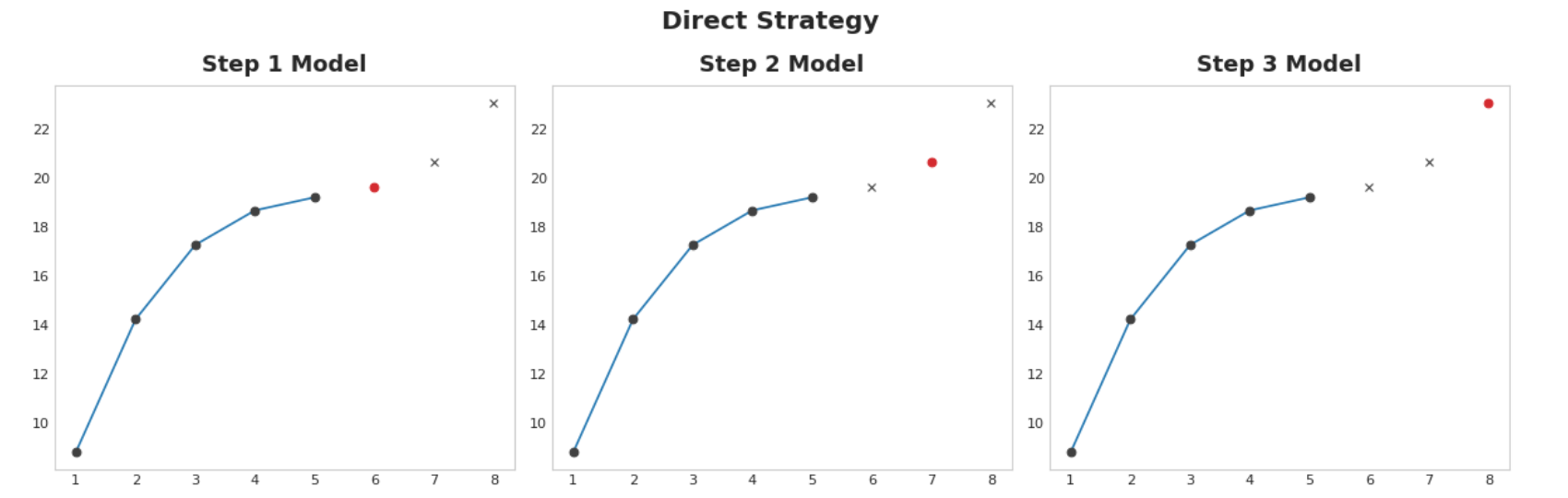 直接策略(Direct strategy) 为视野中的每一步训练一个单独的模型:一个模型预测提前1步,另一个模型预测提前2步,依此类推。预测提前1步与预测提前2步(等等)是不同的问题,因此可以帮助使用不同的模型为每一步进行预测。缺点是训练大量模型的计算成本可能很高。