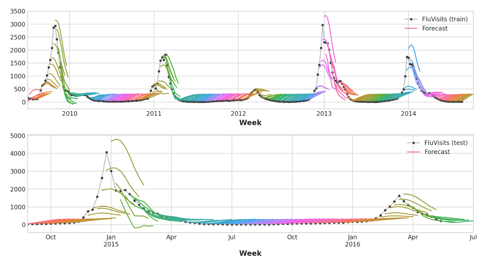1 2 3 4 5 6 7 8 9 10 11 12 train_rmse = mean_squared_error(y_train, y_fit, squared=False ) test_rmse = mean_squared_error(y_test, y_pred, squared=False ) print ((f"Train RMSE: {train_rmse:.2 f} \n" f"Test RMSE: {test_rmse:.2 f} " ))palette = dict (palette='husl' , n_colors=64 ) fig, (ax1, ax2) = plt.subplots(2 , 1 , figsize=(11 , 6 )) ax1 = flu_trends.FluVisits[y_fit.index].plot(**plot_params, ax=ax1) ax1 = plot_multistep(y_fit, ax=ax1, palette_kwargs=palette) _ = ax1.legend(['FluVisits (train)' , 'Forecast' ]) ax2 = flu_trends.FluVisits[y_pred.index].plot(**plot_params, ax=ax2) ax2 = plot_multistep(y_pred, ax=ax2, palette_kwargs=palette) _ = ax2.legend(['FluVisits (test)' , 'Forecast' ])