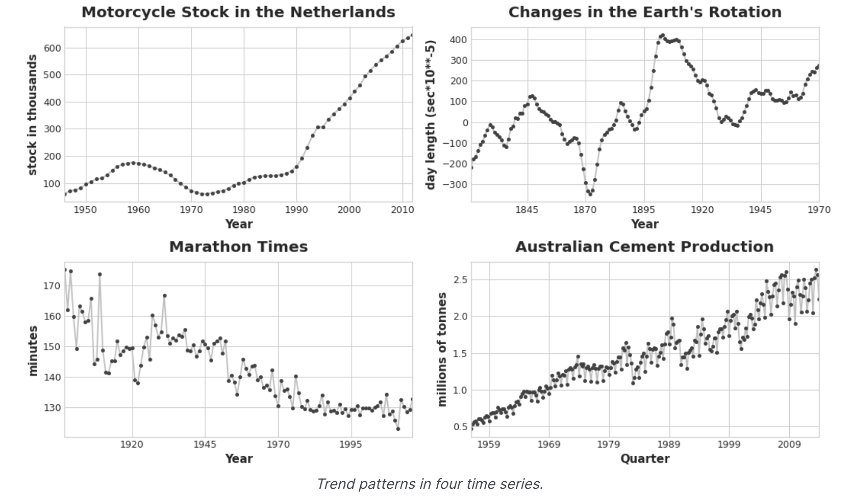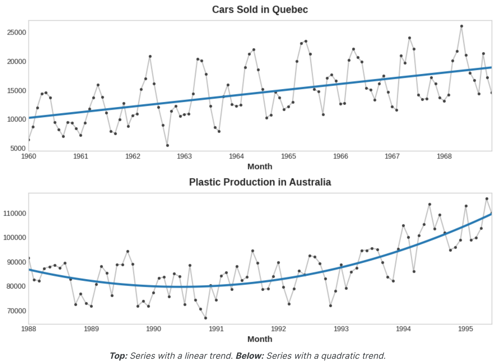我们将重点关注均值趋势。但更一般地说,序列中任何持续且缓慢变化的变化都可能构成趋势——例如,时间序列通常在其变化中具有趋势。