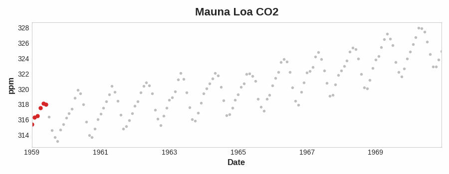 说明线性趋势的移动平均图。曲线上的每个点(蓝色)都是大小为12的窗口内点(红色)的平均值。请注意上面的莫纳罗亚系列如何年复一年地重复上下运动——这是一种短期的季节性变化。要使变化成为趋势的一部分,它发生的时间应该比任何季节变化都要长。因此,为了可视化趋势,我们在比该系列中任何季节周期更长的时期内取平均值。对于Mauna Loa系列,我们选择了12号的窗口,以平滑每年的季节。