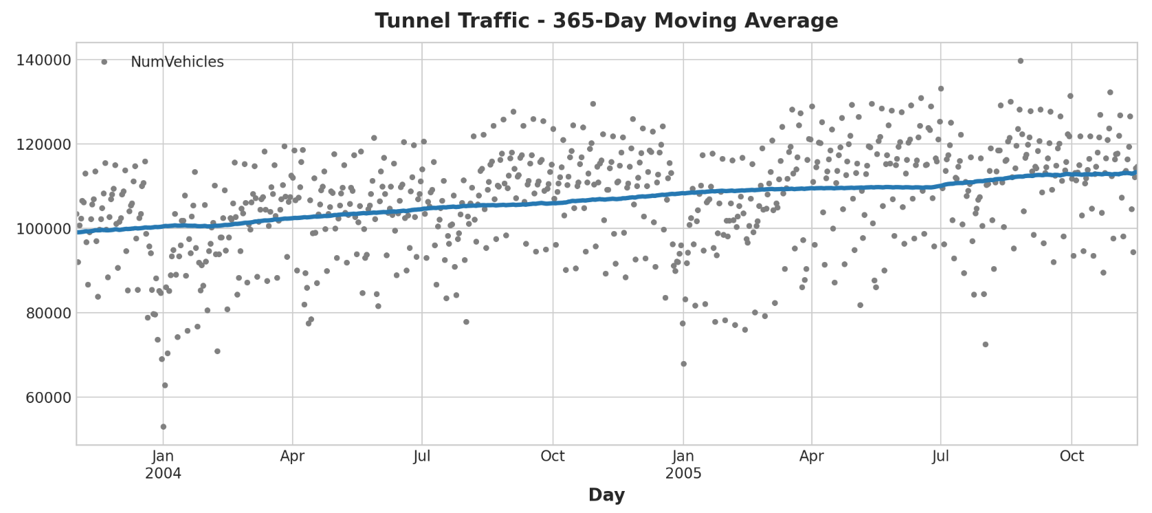1 2 3 4 5 6 7 8 9 10 moving_average = tunnel.rolling( window=365 , center=True , min_periods=183 , ).mean() ax = tunnel.plot(style="." , color="0.5" ) moving_average.plot( ax=ax, linewidth=3 , title="Tunnel Traffic - 365-Day Moving Average" , legend=False , )
