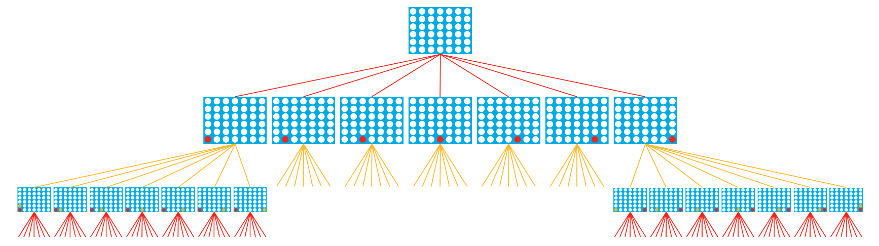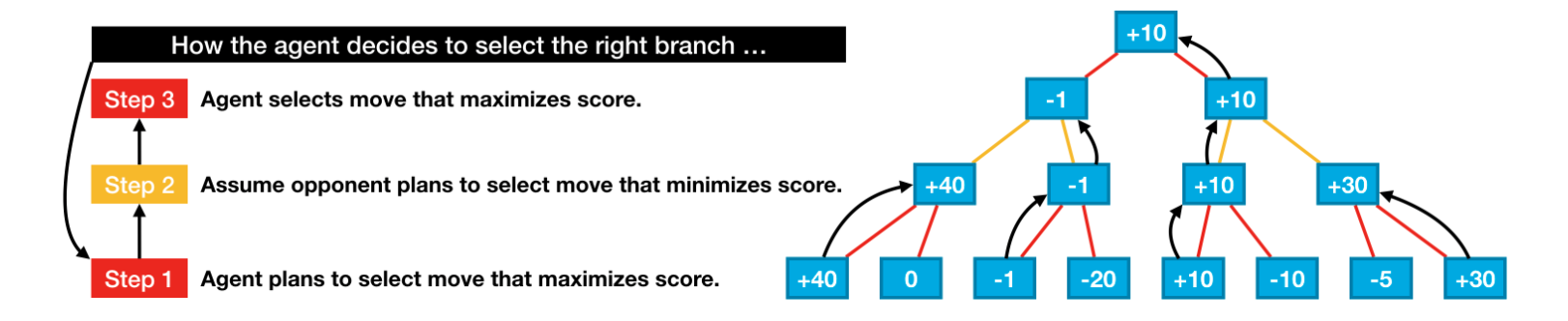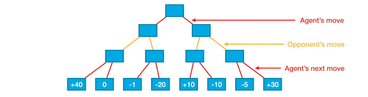 # Minimax implementation defminimax(node, depth, maximizingPlayer, mark, config): is_terminal = is_terminal_node(node, config) valid_moves = [c for c inrange(config.columns) if node[0][c] == 0] if depth == 0or is_terminal: return get_heuristic(node, mark, config) if maximizingPlayer: value = -np.Inf for col in valid_moves: child = drop_piece(node, col, mark, config) value = max(value, minimax(child, depth-1, False, mark, config)) return value else: value = np.Inf for col in valid_moves: child = drop_piece(node, col, mark%2+1, config) value = min(value, minimax(child, depth-1, True, mark, config)) return value