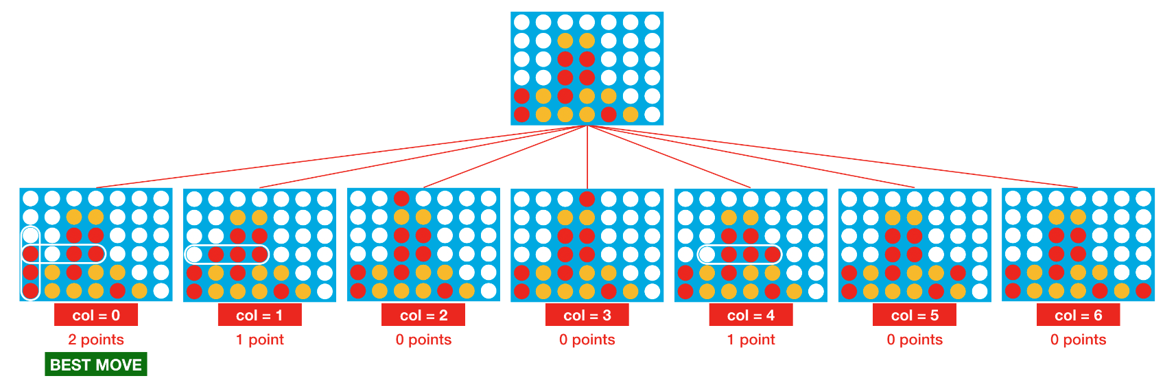# Helper function for score_move: calculates value of heuristic for grid defget_heuristic(grid, mark, config): num_threes = count_windows(grid, 3, mark, config) num_fours = count_windows(grid, 4, mark, config) num_threes_opp = count_windows(grid, 3, mark%2+1, config) score = num_threes - 1e2*num_threes_opp + 1e6*num_fours return score