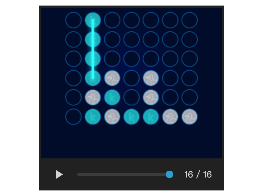 # Helper function for minimax: checks if game has ended defis_terminal_node(grid, config): # Check for draw iflist(grid[0, :]).count(0) == 0: returnTrue # Check for win: horizontal, vertical, or diagonal # horizontal for row inrange(config.rows): for col inrange(config.columns-(config.inarow-1)): window = list(grid[row, col:col+config.inarow]) if is_terminal_window(window, config): returnTrue # vertical for row inrange(config.rows-(config.inarow-1)): for col inrange(config.columns): window = list(grid[row:row+config.inarow, col]) if is_terminal_window(window, config): returnTrue # positive diagonal for row inrange(config.rows-(config.inarow-1)): for col inrange(config.columns-(config.inarow-1)): window = list(grid[range(row, row+config.inarow), range(col, col+config.inarow)]) if is_terminal_window(window, config): returnTrue # negative diagonal for row inrange(config.inarow-1, config.rows): for col inrange(config.columns-(config.inarow-1)): window = list(grid[range(row, row-config.inarow, -1), range(col, col+config.inarow)]) if is_terminal_window(window, config): returnTrue returnFalse