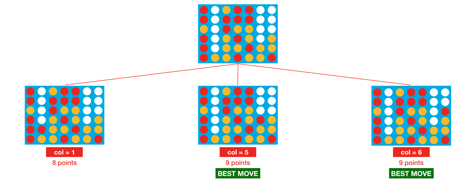 # Uses minimax to calculate value of dropping piece in selected column defscore_move(grid, col, mark, config, nsteps): next_grid = drop_piece(grid, col, mark, config) score = minimax(next_grid, nsteps-1, False, mark, config) return score