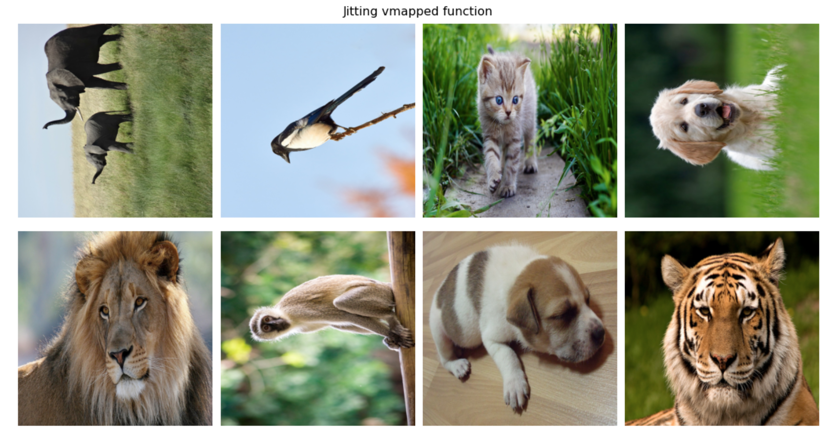 # Get the jitted version of our augmentation functions random_rotate_jitted = jit(vmap(random_rotate, in_axes=(0, 0))) random_horizontal_flip_jitted = jit(vmap(random_horizontal_flip, in_axes=(0, 0))) random_vertical_flip_jitted = jit(vmap(random_vertical_flip, in_axes=(0, 0)))