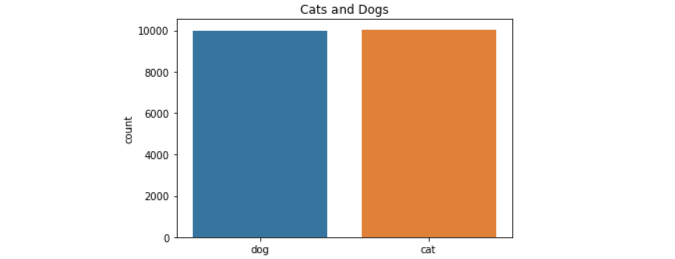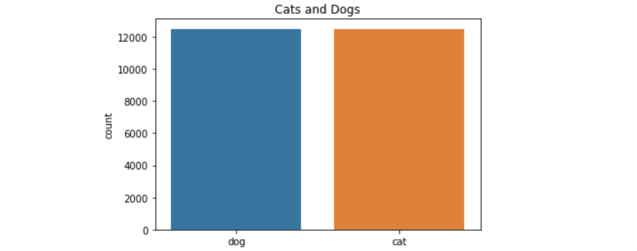 1 2 3 4 5 6 7 8 def plot_image_list_count (data_image_list ): labels = [] for img in data_image_list: labels.append(img.split('.' )[-3 ]) sns.countplot(labels) plt.title('Cats and Dogs' ) plot_image_list_count(train_image_list)