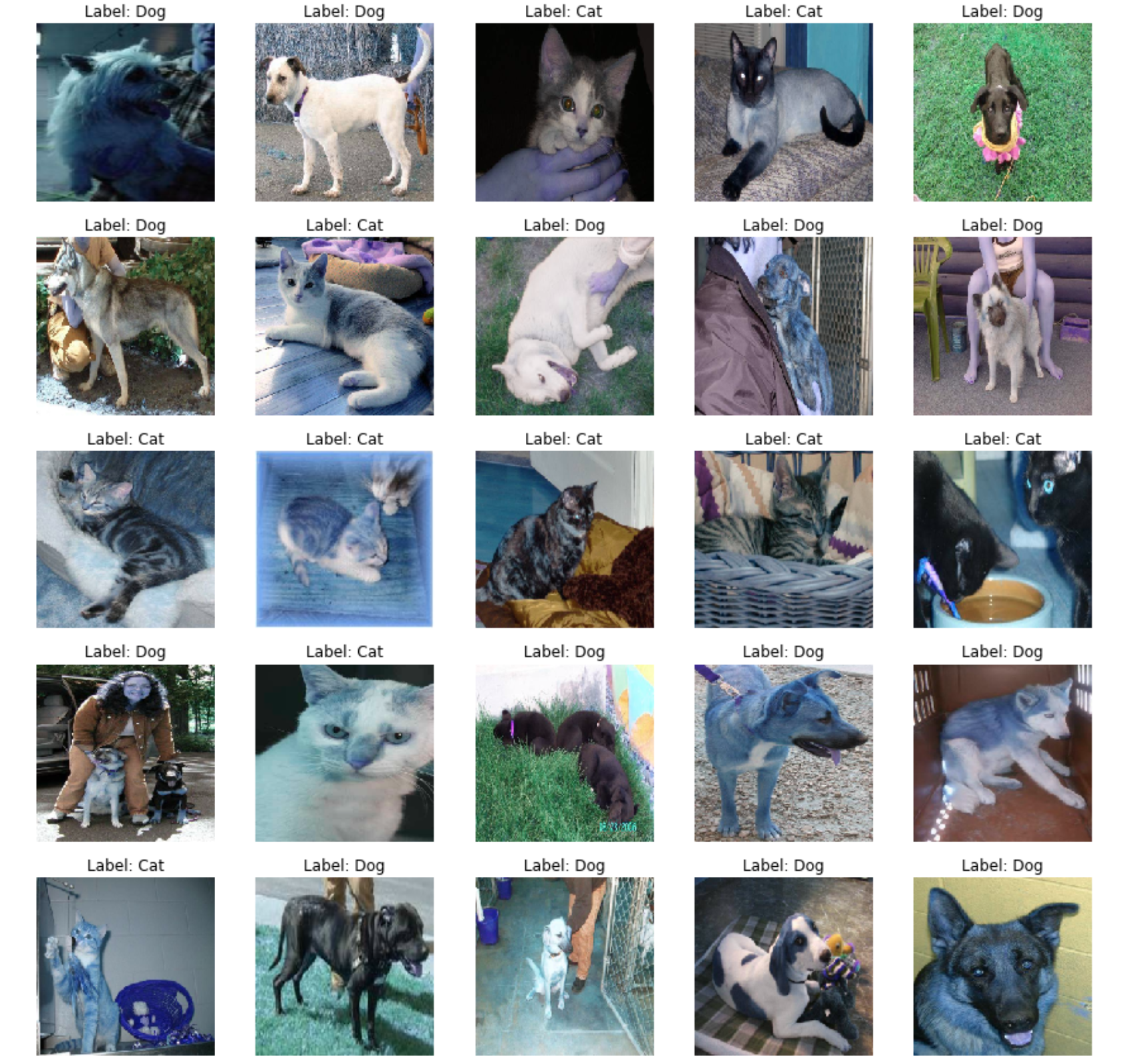 图片样本 让我们重新呈现一些图片。我们从数据集中进行选择。我们将展示训练集中的前25张图片。首先,我们处理训练数据,读取图片并创建包含图片和标签的表格。如果数据是训练集,则标签是通过一次热编码计算得到的标签;如果数据来自测试集,标签将是图片编号。