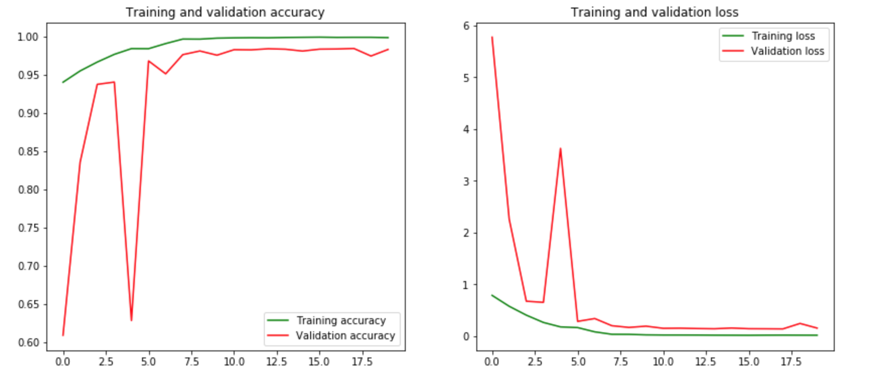 1 2 3 4 5 6 7 8 9 10 11 12 13 14 15 16 17 18 19 def plot_accuracy_and_loss (train_model ): hist = train_model.history acc = hist['acc' ] val_acc = hist['val_acc' ] loss = hist['loss' ] val_loss = hist['val_loss' ] epochs = range (len (acc)) f, ax = plt.subplots(1 ,2 , figsize=(14 ,6 )) ax[0 ].plot(epochs, acc, 'g' , label='Training accuracy' ) ax[0 ].plot(epochs, val_acc, 'r' , label='Validation accuracy' ) ax[0 ].set_title('Training and validation accuracy' ) ax[0 ].legend() ax[1 ].plot(epochs, loss, 'g' , label='Training loss' ) ax[1 ].plot(epochs, val_loss, 'r' , label='Validation loss' ) ax[1 ].set_title('Training and validation loss' ) ax[1 ].legend() plt.show() plot_accuracy_and_loss(train_model)