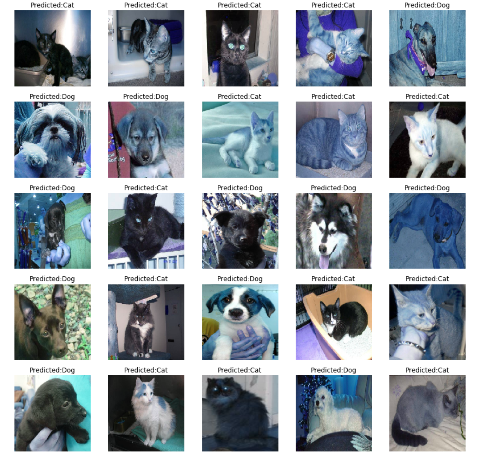 1 2 3 4 5 6 7 8 9 10 11 12 13 14 15 16 f, ax = plt.subplots(5 ,5 , figsize=(15 ,15 )) for i,data in enumerate (test[:25 ]): img_num = data[1 ] img_data = data[0 ] orig = img_data data = img_data.reshape(-1 ,IMG_SIZE,IMG_SIZE,3 ) model_out = model.predict([data])[0 ] if np.argmax(model_out) == 1 : str_predicted='Dog' else : str_predicted='Cat' ax[i//5 , i%5 ].imshow(orig) ax[i//5 , i%5 ].axis('off' ) ax[i//5 , i%5 ].set_title("Predicted:{}" .format (str_predicted)) plt.show()