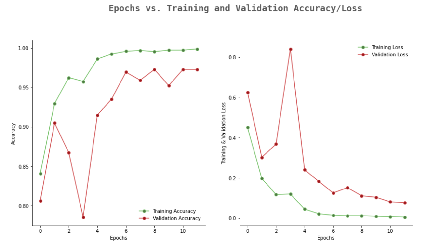 sns.despine() ax[1].plot(epochs, train_loss, marker='o',markerfacecolor=colors_green[2],color=colors_green[3], label ='Training Loss') ax[1].plot(epochs, val_loss, marker='o',markerfacecolor=colors_red[2],color=colors_red[3], label = 'Validation Loss') ax[1].legend(frameon=False) ax[1].set_xlabel('Epochs') ax[1].set_ylabel('Training & Validation Loss')