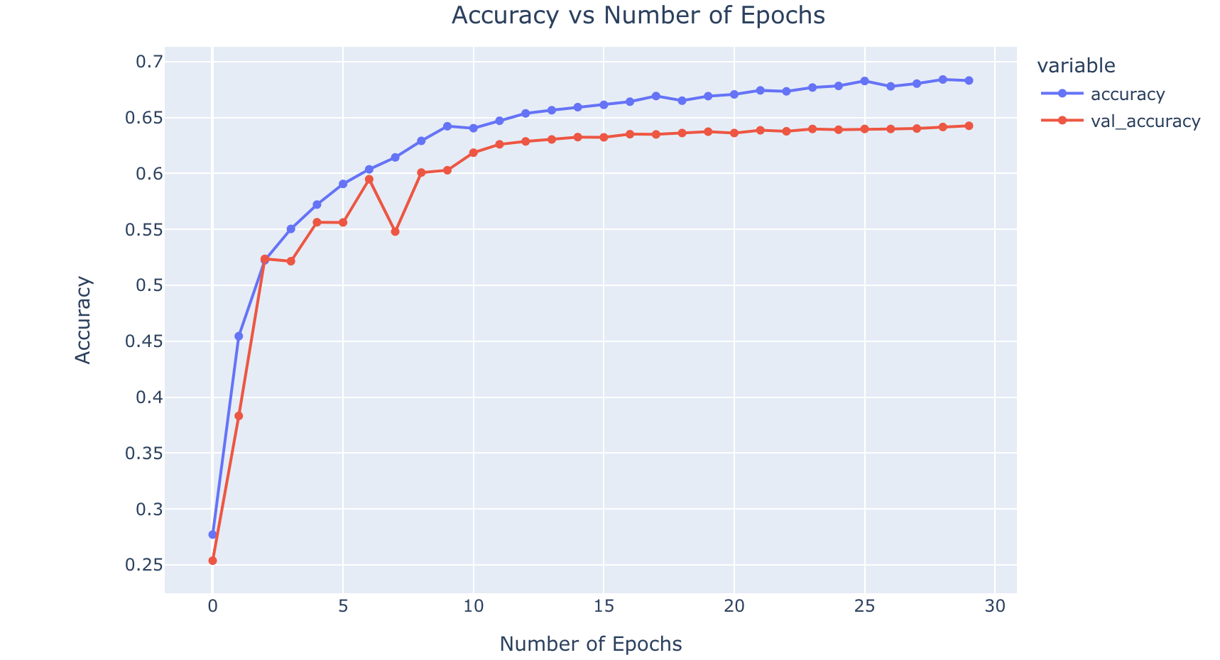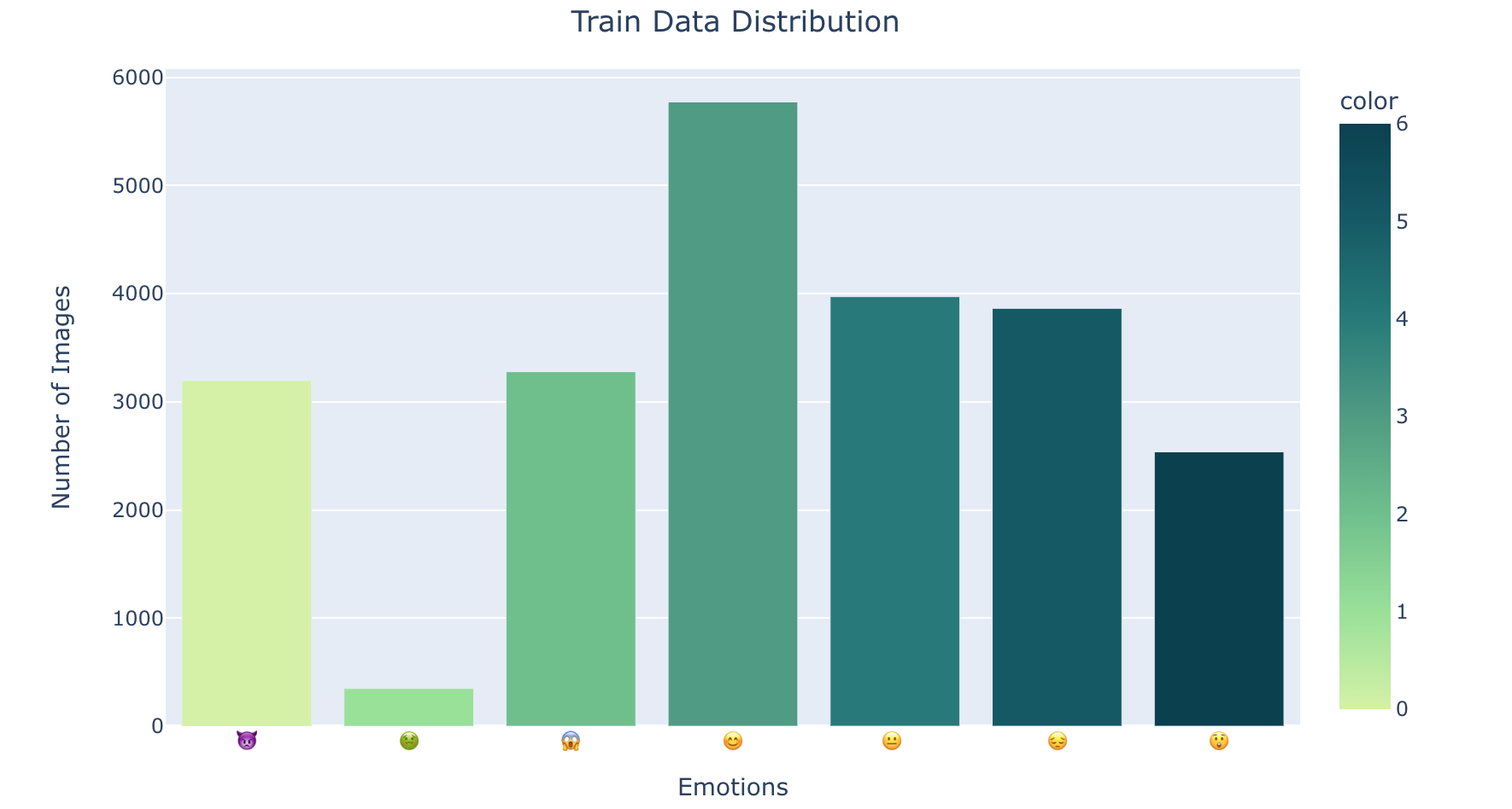 fig = px.bar(x = CLASS_LABELS_EMOJIS, y = [list(train_generator.classes).count(i) for i in np.unique(train_generator.classes)] , color = np.unique(train_generator.classes) , color_continuous_scale="Emrld") fig.update_xaxes(title="Emotions") fig.update_yaxes(title = "Number of Images") fig.update_layout(showlegend = True, title = { 'text': 'Train Data Distribution ', 'y':0.95, 'x':0.5, 'xanchor': 'center', 'yanchor': 'top'}) fig.show()