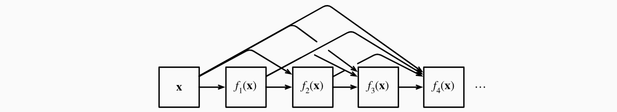 也就是说,ResNet将分解为两部分:一个简单的线性项和一个复杂的非线性项。那么再向前拓展一步,如果我们想将拓展成超过两部分的信息呢?一种方案便是DenseNet。