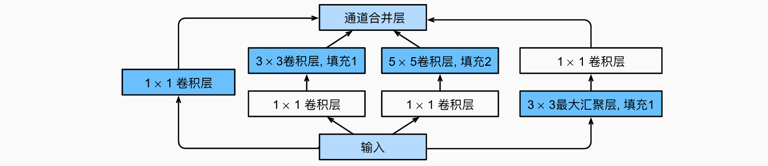 class Inception(tf.keras.Model): def __init__(self, c1, c2, c3, c4): super().__init__() self.p1_1 = tf.keras.layers.Conv2D(c1, 1, activation='relu') self.p2_1 = tf.keras.layers.Conv2D(c2[0], 1, activation='relu') self.p2_2 = tf.keras.layers.Conv2D(c2[1], 3, padding='same',activation='relu') self.p3_1 = tf.keras.layers.Conv2D(c3[0], 1, activation='relu') self.p3_2 = tf.keras.layers.Conv2D(c3[1], 5, padding='same',activation='relu') self.p4_1 = tf.keras.layers.MaxPool2D(3, 1, padding='same') self.p4_2 = tf.keras.layers.Conv2D(c4, 1, activation='relu')